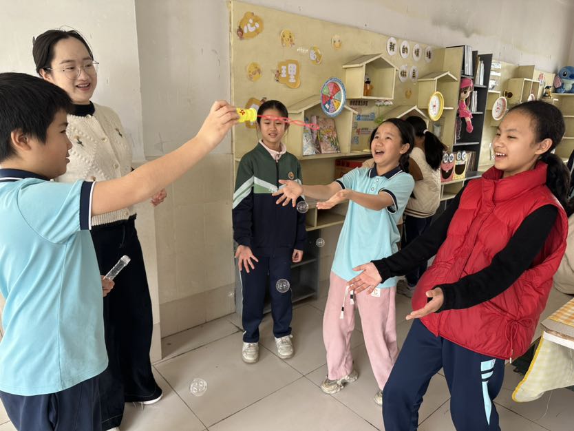 “我最喜欢吹塑料袋游戏,它能锻炼肺活量。以前我声音很小,现在上课敢大声发言了,人也更有胆量。”六年级学生温栩可分享道。