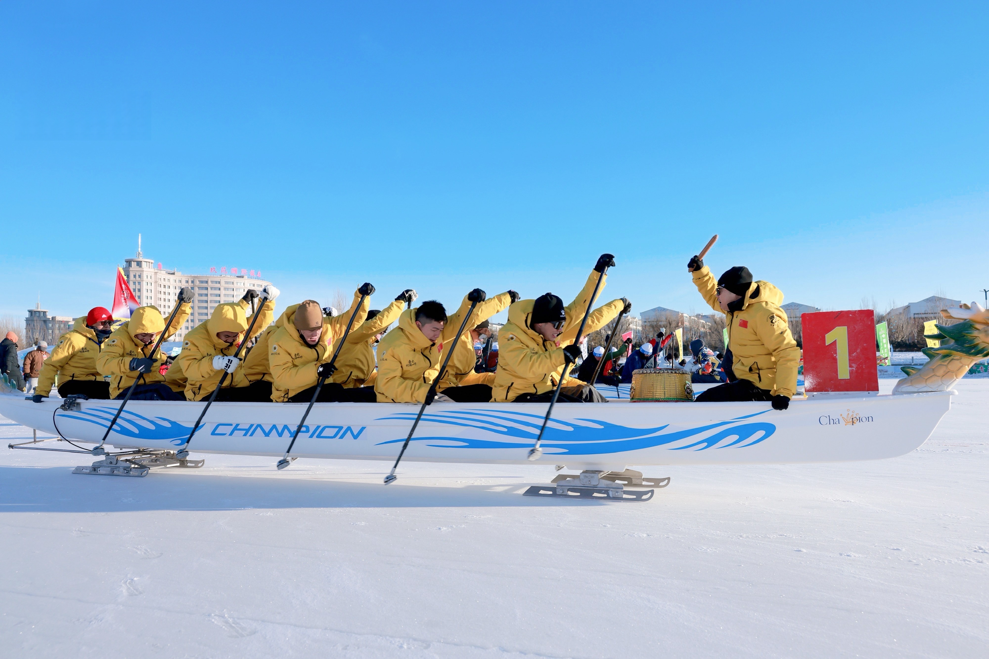 零下二十多摄氏度的草原寒风中,一支来自岭南水乡的龙船队,在冰面赛道上划出了属于佛山的速度。