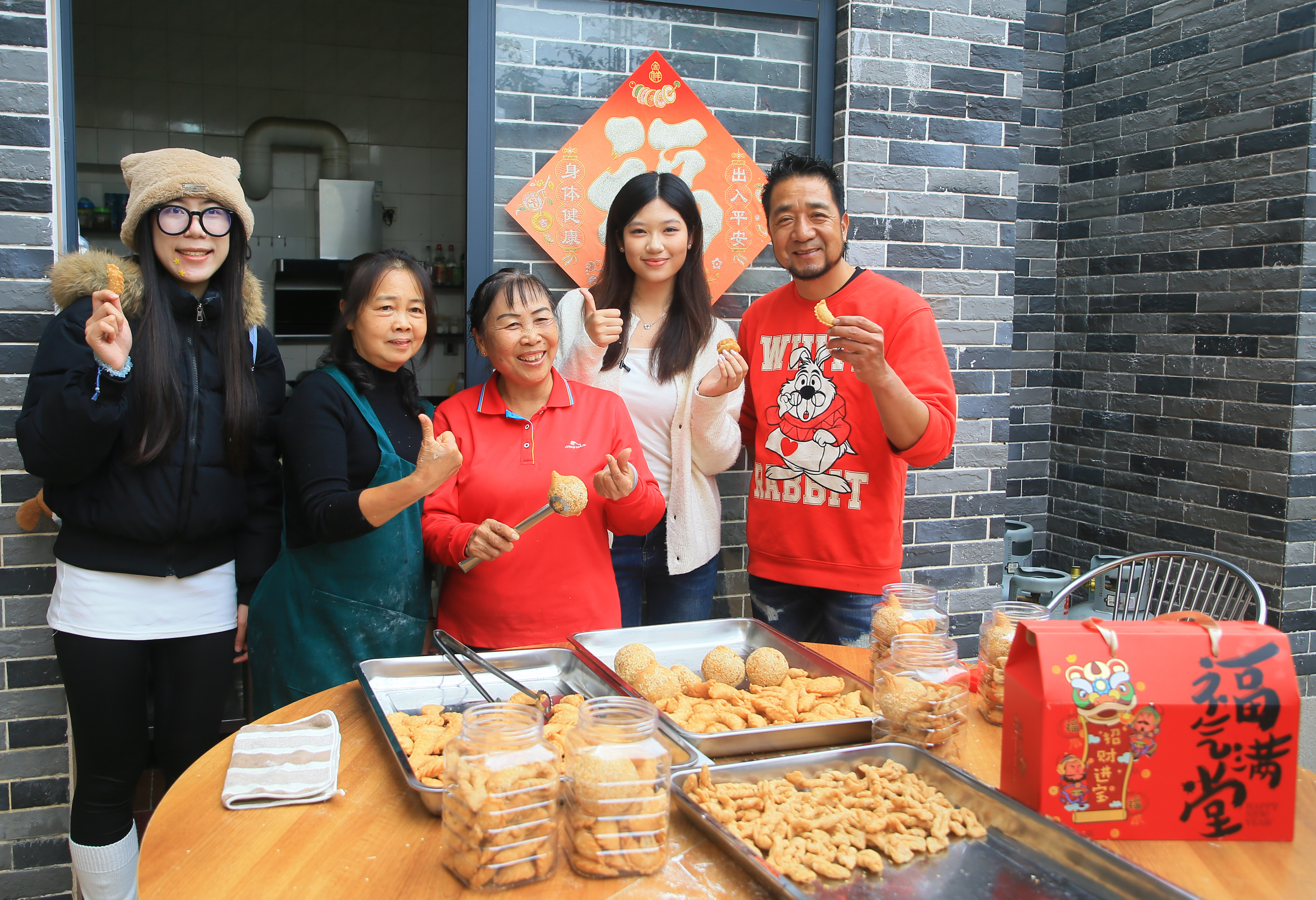 “农村里就是有这份热乎气,邻里像亲人一样互相搭把手,这就是最踏实的幸福。”在炮仗花盛放的小院里,六七张竹椅围拢着一张青石板桌,身穿红衣的少轩姨正与街坊们一同揉面皮、包油角、炸煎堆,猪油混着面粉的香气在指尖流转。