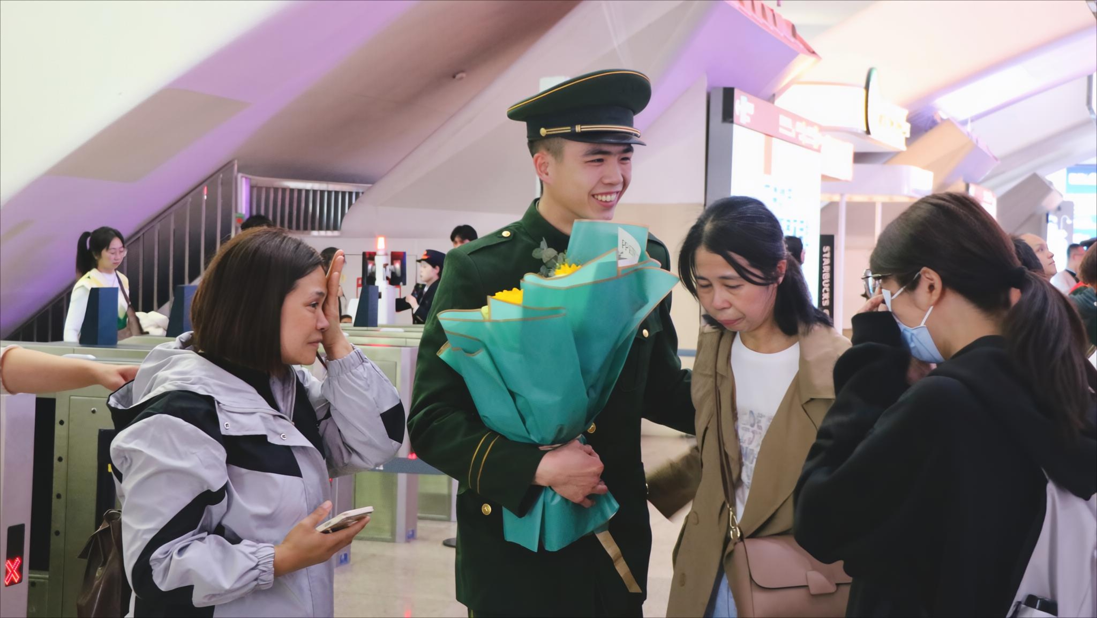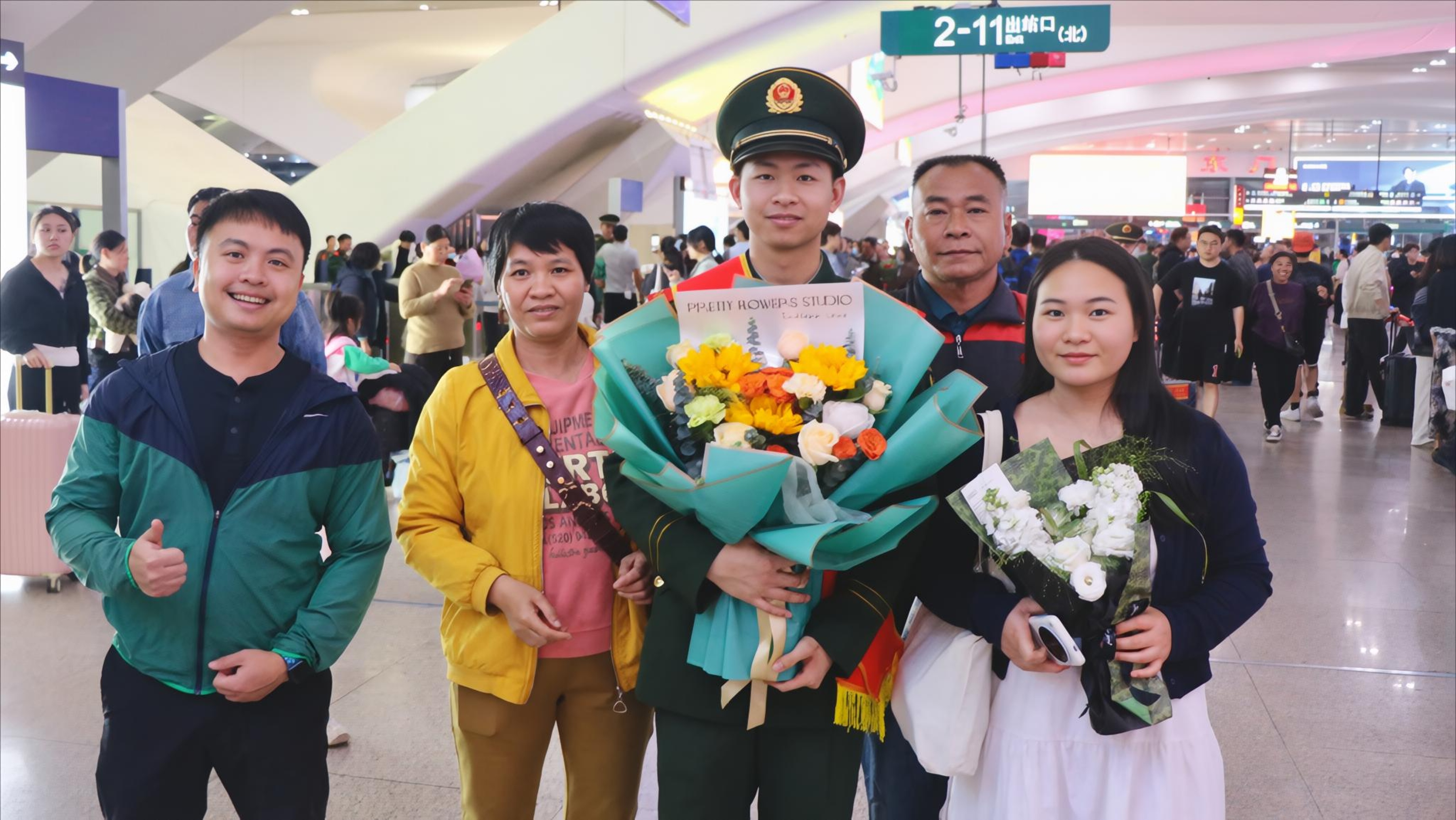 当晚,广州南站出站口的等候迎接队伍,大家手持欢迎标语满怀期待,迎接载誉归来的高明子弟兵。晚9时许,10名退役军人身着戎装、身姿挺拔、精神抖擞,有序走出出站通道。等候的亲友立刻上前,献上鲜花与拥抱,一句句“欢迎回家”“辛苦了”,道尽思念与骄傲。区退役军人事务局相关负责人与退役军人一一握手致意,感谢他们为国防和军队建设作出贡献,欢迎他们回到家乡、扎根家乡、建设家乡。