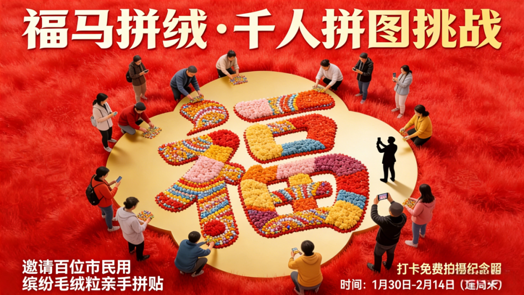 “新春绒粒拼马”万人共创艺术计划启动,携手拼贴10米巨幅“醒狮,合影即赠限定祈福牌!还有“马上有爱情”全城热恋,心动巡游派发玫瑰气球,定制双人套餐浪漫开席,带TA来领证式打卡!