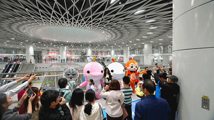当天下午,深圳地铁岗厦北枢纽化身为一座充满欢声笑语的“福气乐园”。备受喜爱的“中国电视报豹豹”、十五运会吉祥物“大湾鸡”与“福气家族”惊喜现身,憨态可掬的造型与热情互动迅速成为全场焦点。