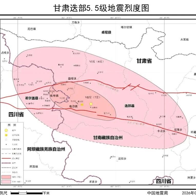 中国地震局发布甘肃迭部5.5级地震烈度图