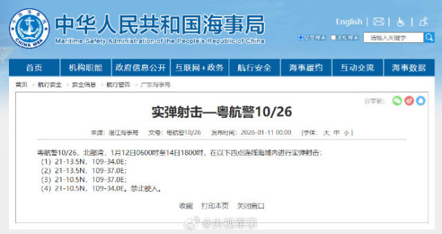 据中国海事局网站消息,湛江海事局发布航行警告,1月12日6时至14日18时,北部湾部分海域进行实弹射击,禁止驶入。
