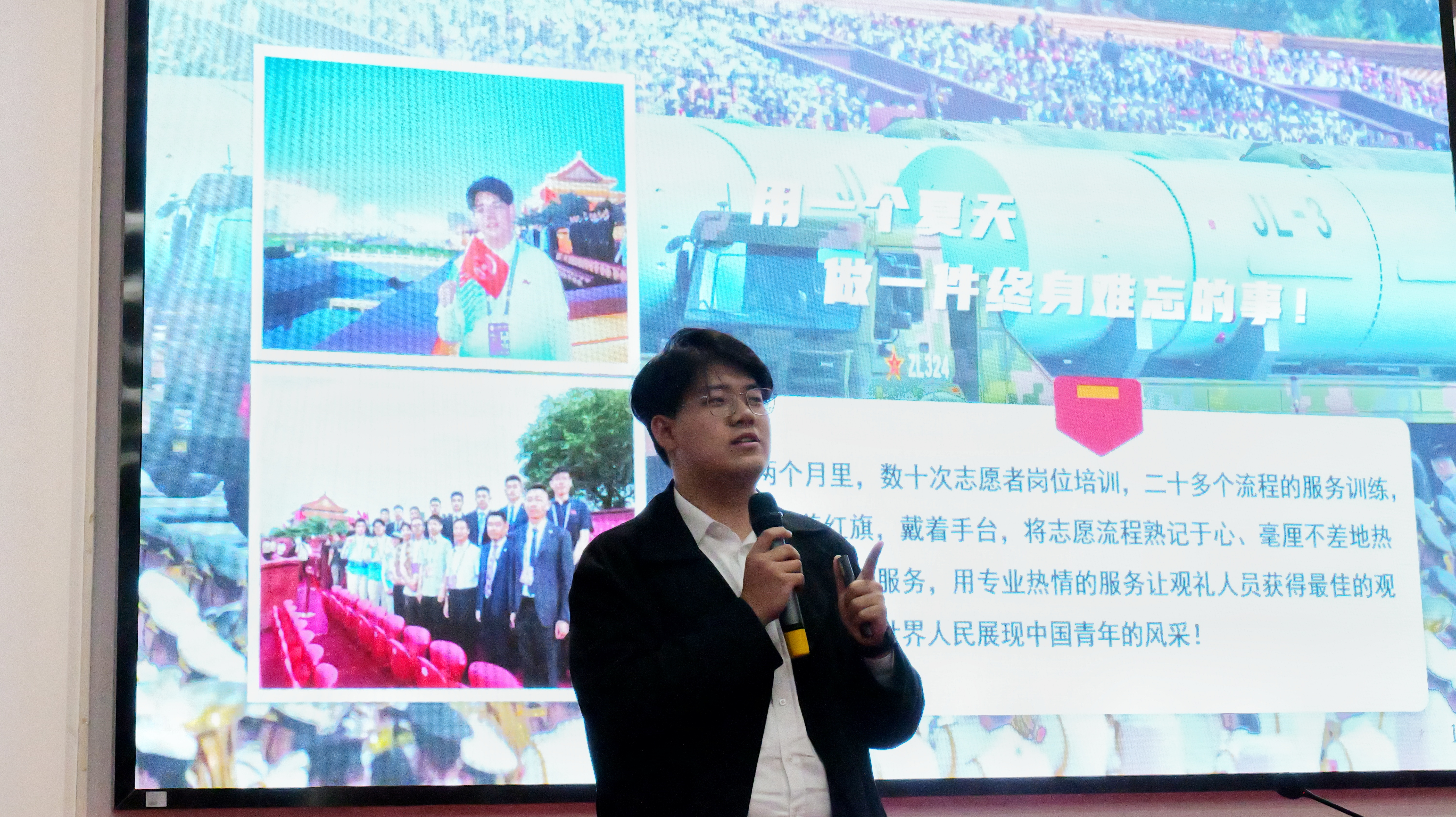 宣讲中,北大博士生讲师团成员以青春视角传递思想伟力。邱博然结合天安门观礼台志愿服务经历,在纪念抗战胜利80周年的时代背景下,通过历次阅兵对比与一线志愿感悟,生动诠释伟大抗战精神,引导学子从历史中汲取奋进力量。