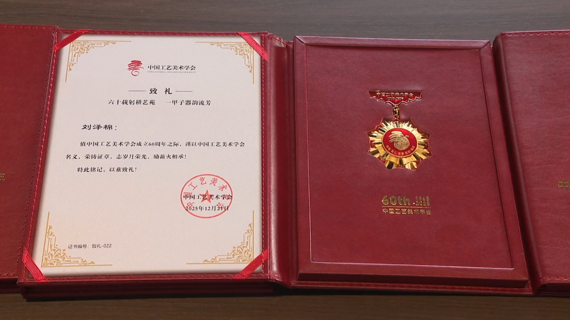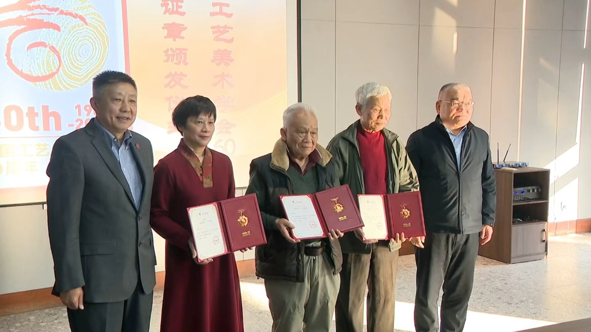 1月13日下午,佛山市新石湾美术陶瓷厂有限公司会议室暖意融融、掌声雷动,一场重量级的证章颁发仪式在此隆重举行。中国工艺美术学会党委书记、理事长才大颖,广东省工艺美术学会会长花红林等人亲临现场,为林明体、刘泽棉、刘炳三位中国工艺美术大师现场颁发“中国工艺美术终身成就奖”证章;已溘然长逝的梅文鼎、黄松坚两位大师,其荣誉证章分别由子女梅晓山、黄志伟代为领取。