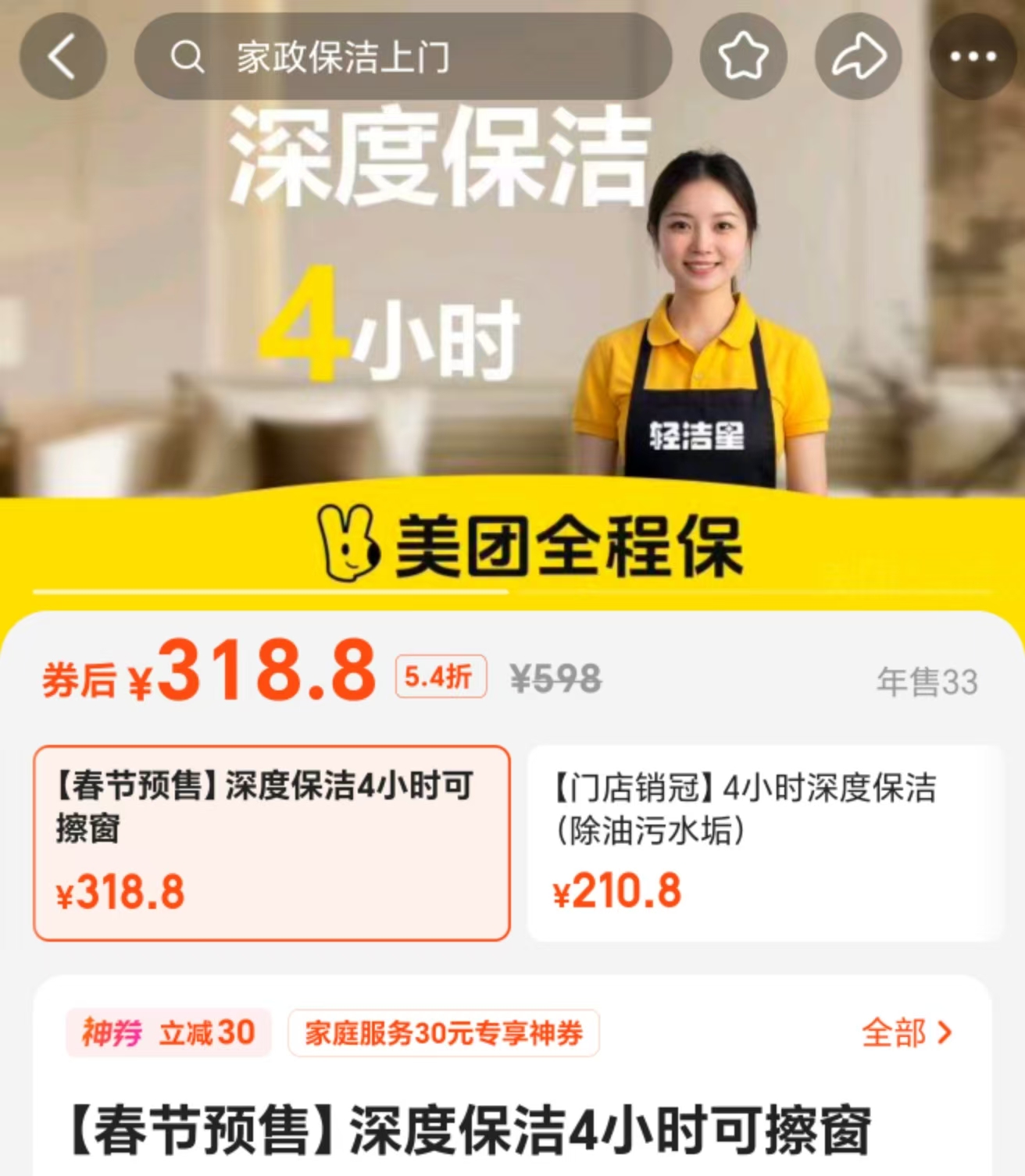电商平台客服提醒,当前预订的家政服务均设有使用有效期,消费者若在有效期内预约服务,即便春节期间也能享受到值班师傅的上门服务。不过,若等到春节假期临近再临时预约,服务价格大概率会出现上调。记者通过比价软件查询进一步发现,对比2025年春节前的家政服务报价,同类服务当时的价格较现阶段上涨约30%。