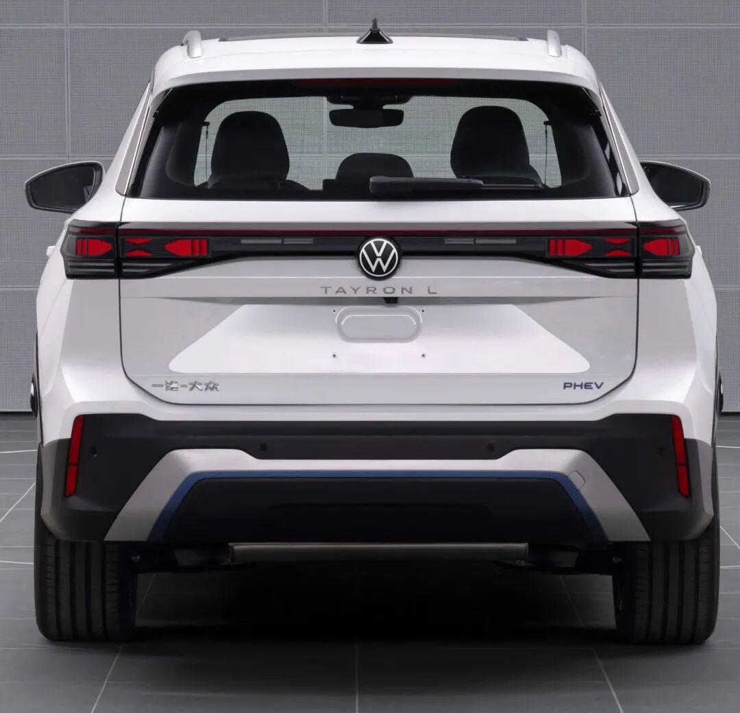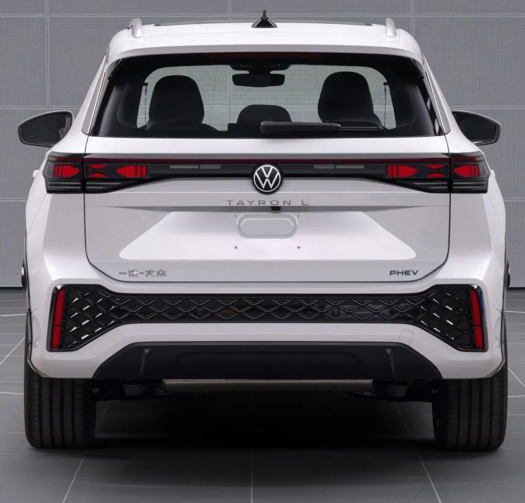 车身侧面,新车简洁流畅,配备传统造型的车门把手,并对外后视镜进行黑化处理,整体看起来非常大气。车尾部分,新车尾灯为贯穿式设计,中央同样镶嵌了可发光的品牌LOGO标识,尾灯下方还带有“TAYRON L”字母标识,右下方为“PHEV”,左下方为“一汽-大众”,进一步提升了车辆的辨识度。常规版本车型和R-Line版本车型尾部主要的区别在于后保险杠区域的装饰条设计上,前者看起来更为简约大气,后者则带有黑色的网格装饰,展现出强烈的运动属性。排气方面,新车采用隐藏式排气布局。