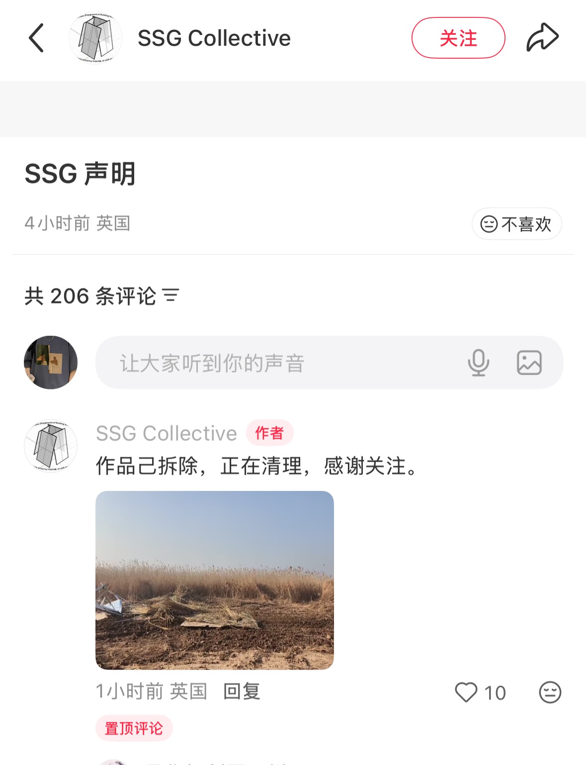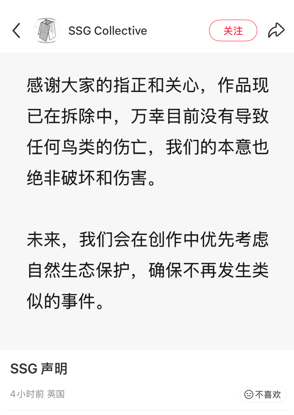 同日下午2时许,《浮土》主创团队SSG发布声明称,“感谢大家的指正和关心,作品现在已经在拆除中,万幸目前没有导致任何鸟类的伤亡,我们的本意也绝非破坏和伤害。未来,我们会在创作中优先考虑自然生态保护,确保不再发生类似事件。”