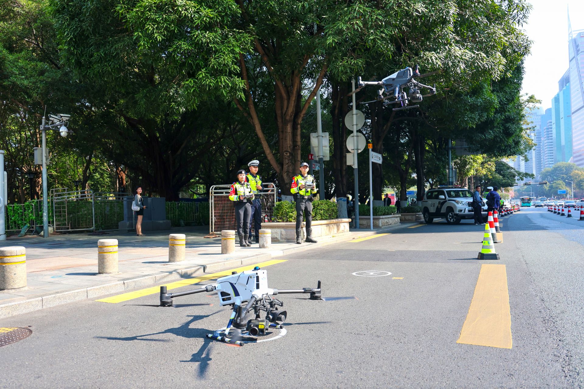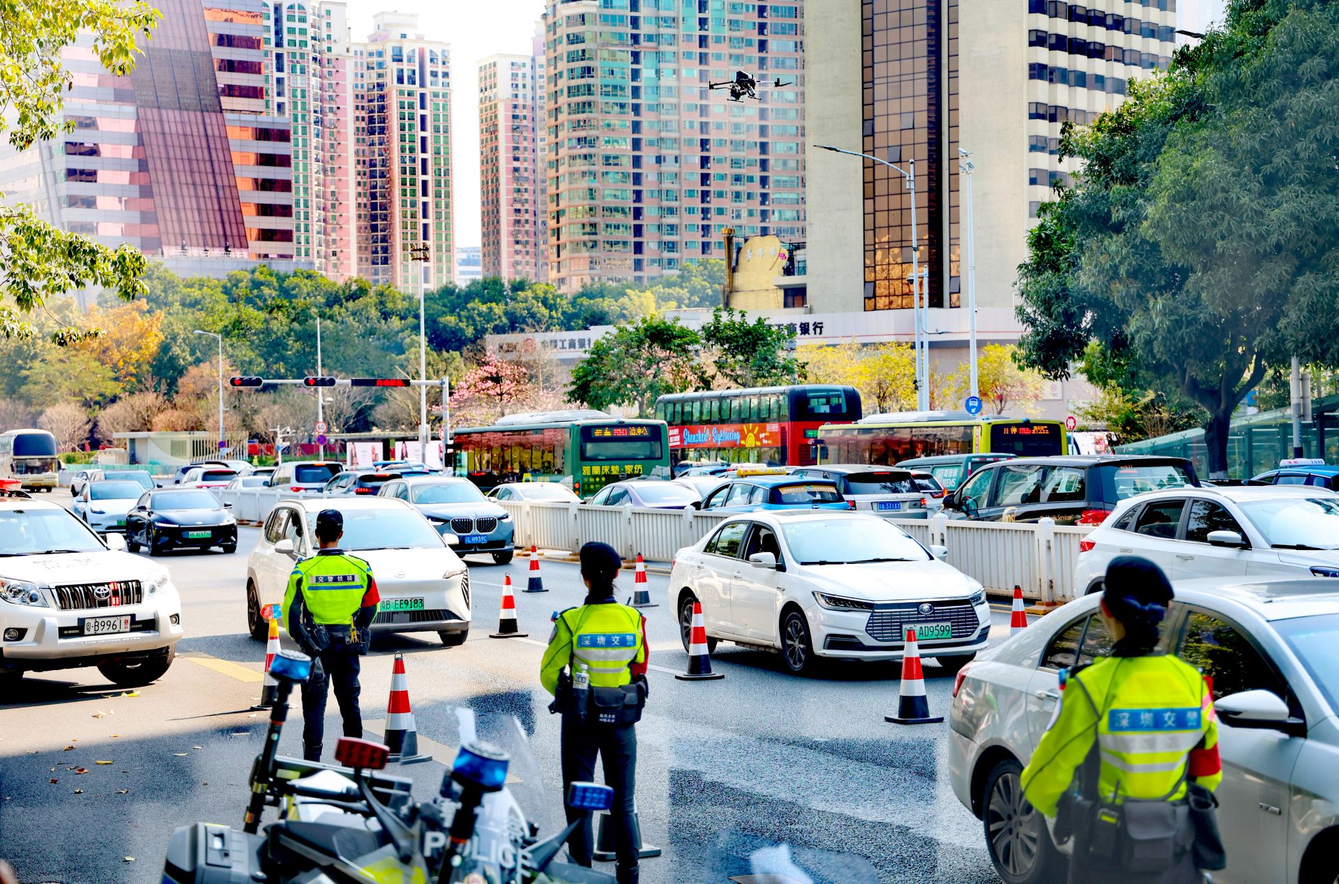 行动开始当天,记者看到交警在深南大道沿线布设多个整治点位,对全路段进行覆盖管控。在深南红岭路口的整治现场,两台警用无人机搭载高清摄像头在空中巡飞,实时捕捉电动车违规驶入机动车道、逆行、违法载人、未佩戴安全头盔等违法行为,并将违法画面传输至地面警力进行查处,同步循环播放提示语音开展劝导、警示。