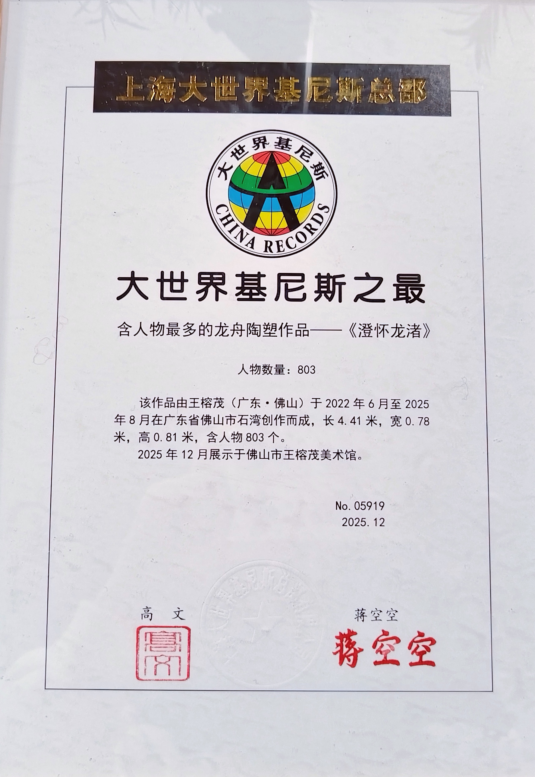1月17日,大世界基尼斯之最颁证仪式在禅城石湾柒号陶仓的王榕茂美术馆内成功举行。仪式上,上海大世界基尼斯总部认证官郑清怡将“含人物最多的龙舟陶塑作品”证书交到广东省陶艺大师王榕茂手中,全场响起热烈的掌声——这不仅是一位艺术家的高光时刻,更是国家级非物质文化遗产“石湾陶塑”在新时代焕发蓬勃生命力的有力见证。
