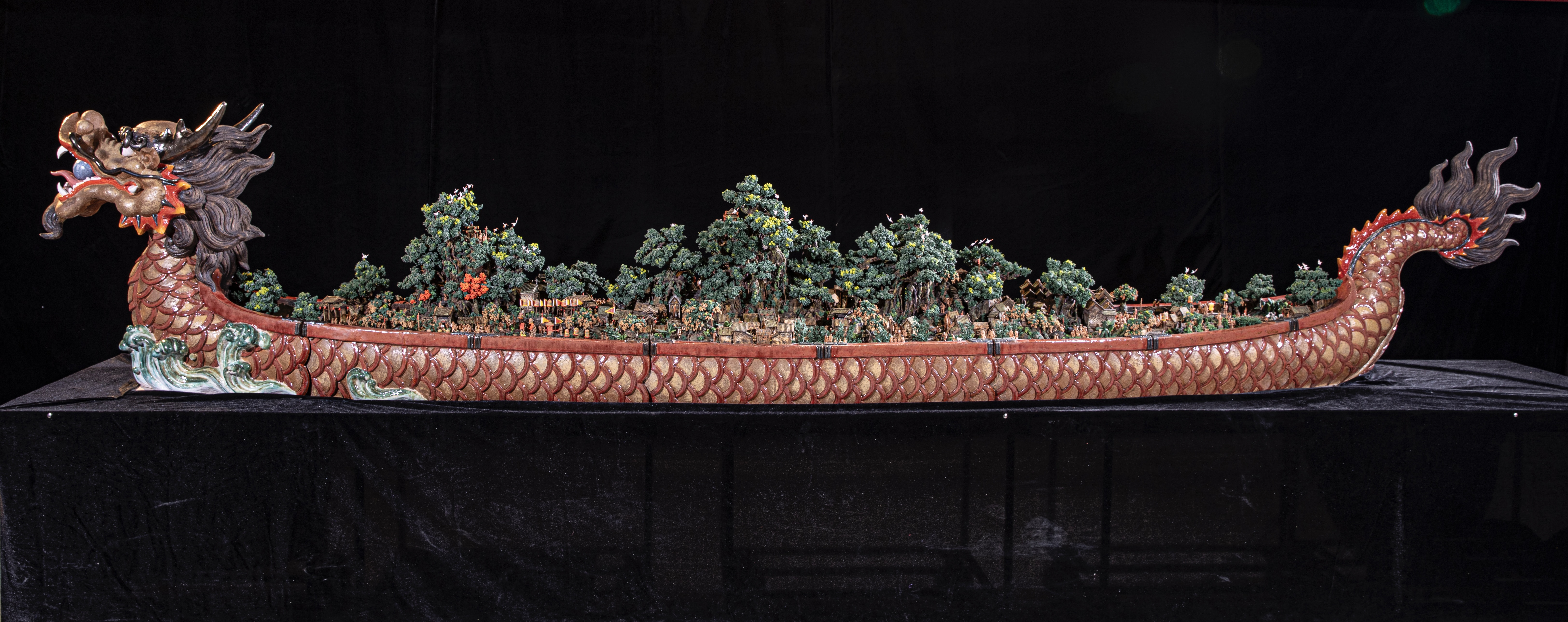 陶塑巨作《澄怀龙渚》全长441厘米、宽78厘米、高81厘米,共塑造803位人物,创下全球龙舟主题陶塑人物数量之最。作品以一艘气势恢宏的龙舟为叙事载体,全景式还原顺德龙眼村历史风貌,精塑803位村民,浓缩了梁氏家祠贺寿、吕氏水埠头迎亲、龙眼点睛、万人共赴“龙船饭”等极具岭南水乡特色的民俗场景,堪称一部“可触摸的立体村志”。
