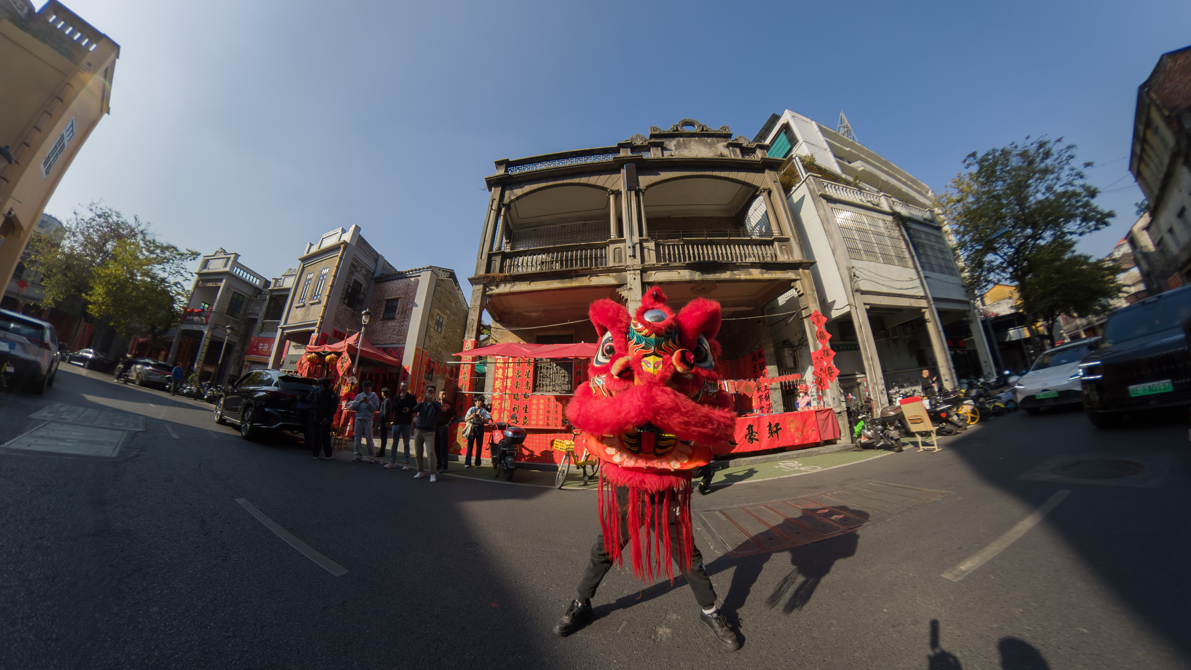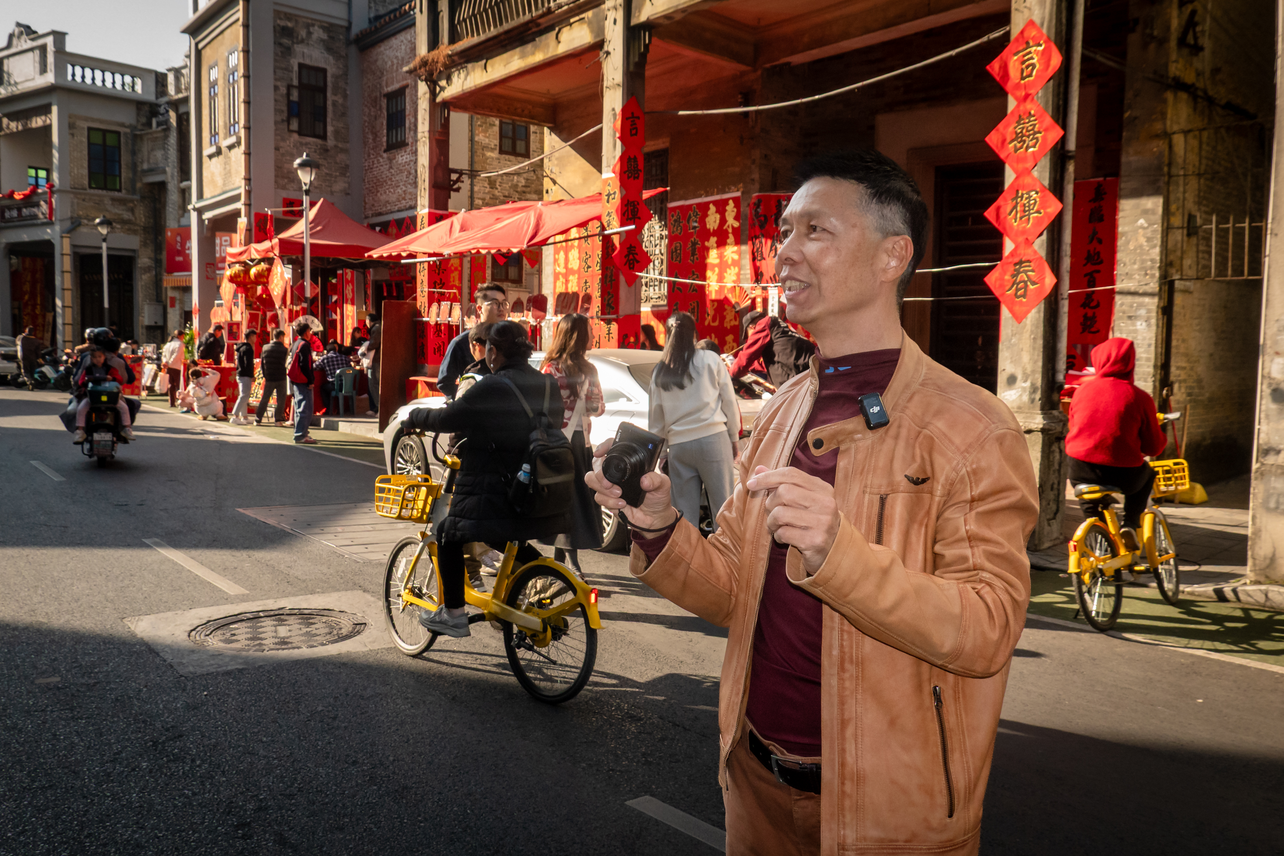 这条100余米长的老街,被孔林光拆解成十多幅镜头片段——从斑驳骑楼的檐角,到挂满红灯笼的铺面前,再到载着年桔、福字穿梭的街巷人流,他将这些散落的烟火瞬间串联拼接,让整条街的新春热闹与岁月质感,完整地凝在了一幅画面里。