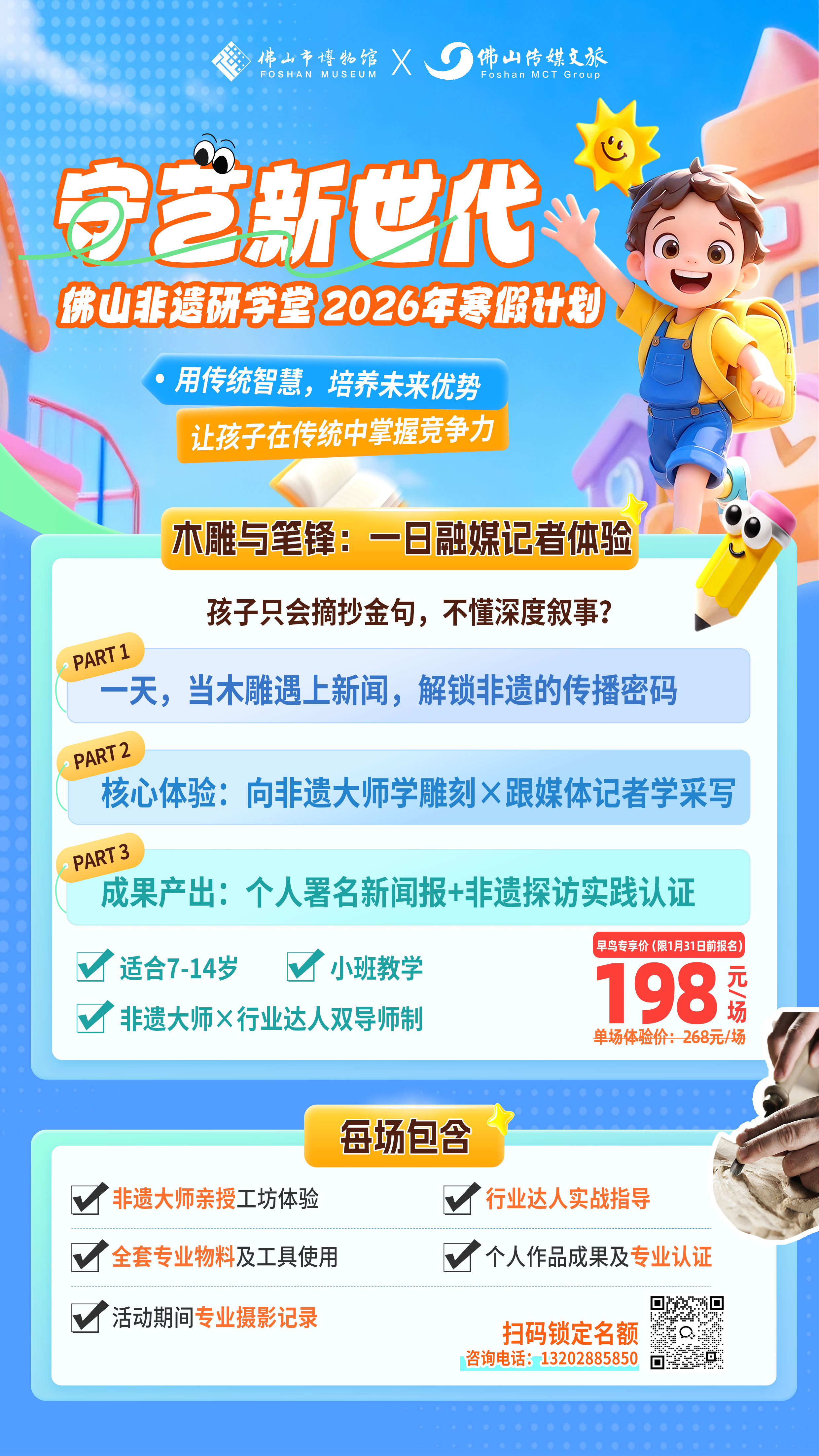 “艺”既指代佛山精湛的非遗技艺,也谐音“意”,代表创意与心意;“非遗不止于手传,更在于思创”,旨在引导青少年在动手实践中进行深度思考,将传统文化基因转化为面向未来的创新能力。