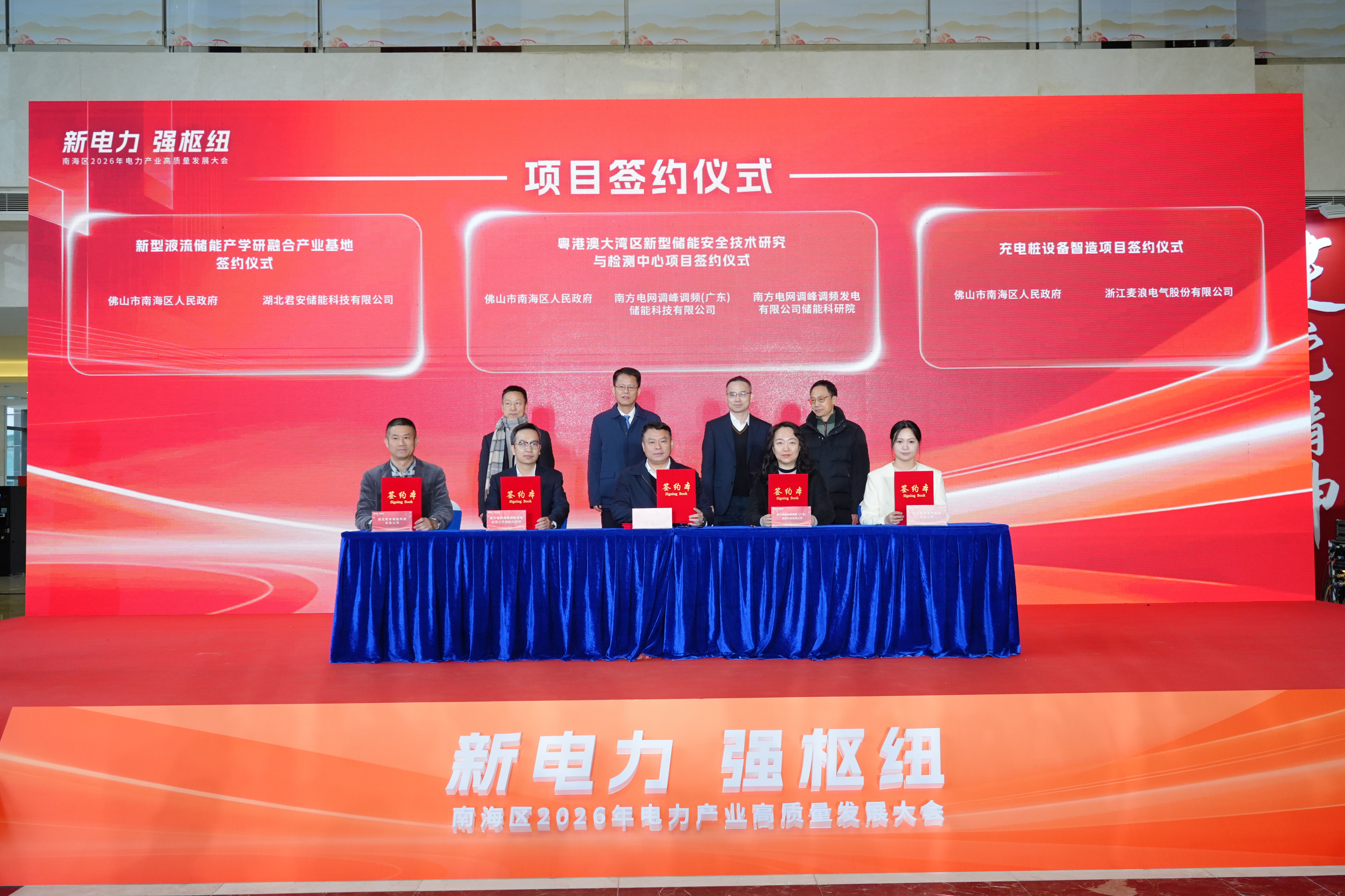 其中,南海区政府与南方电网调峰调频(广东)储能科技有限公司、南方电网调峰调频发电有限公司储能科研院签订协议,依托宝塘储能电站,在狮山镇建设一座粤港澳大湾区新型储能安全技术研究中心;与湖北君安储能科技有限公司签订协议,在狮山镇打造一座粤港澳大湾区重要的新型液流储能电池技术研发、人才培养与智能制造的一体化产业基地;与浙江麦浪电气股份有限公司签订协议,打造一座充电基础设施智造基地,提供充电基础设施从研发到生产到布点再到能源调度的全生命周期服务。