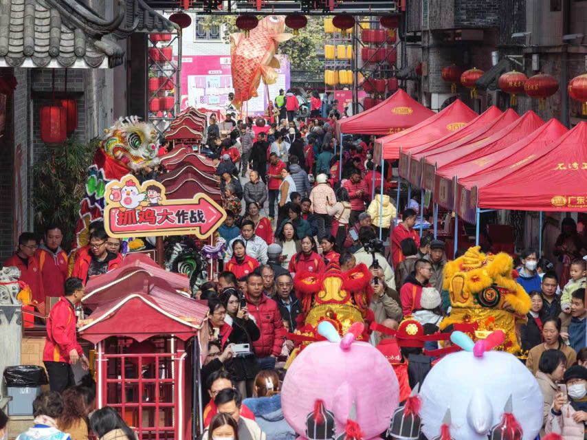 鼓点铿锵,醒狮腾跃,五路财神拱手送福,宋装士兵列队巡游。1月24日上午,陈太吉酒庄景区朱紫街人头攒动,为期两天的“朱紫墟市·非遗年货”活动在吆喝声、欢笑声、碰杯声中火热开市。数十家非遗老字号摊位齐齐亮相,琳琅满目的广式年货,吸引众多市民一大早就前去“赶市”,提前领略岭南非遗年味。