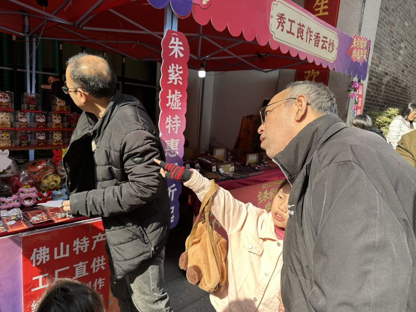 早上十点半不到,朱紫街的青石板路已被熙攘的人群踩热。“快来看,这里有捉鸡比赛!”家住附近的张女士牵着孩子,兴冲冲地挤进人群,孩童的欢呼声此起彼伏。不远处,谢小姐正对着一套石湾陶瓷摆件爱不释手:“石湾的陶瓷很有特色,买回去摆在家里,年味一下子就浓了。”