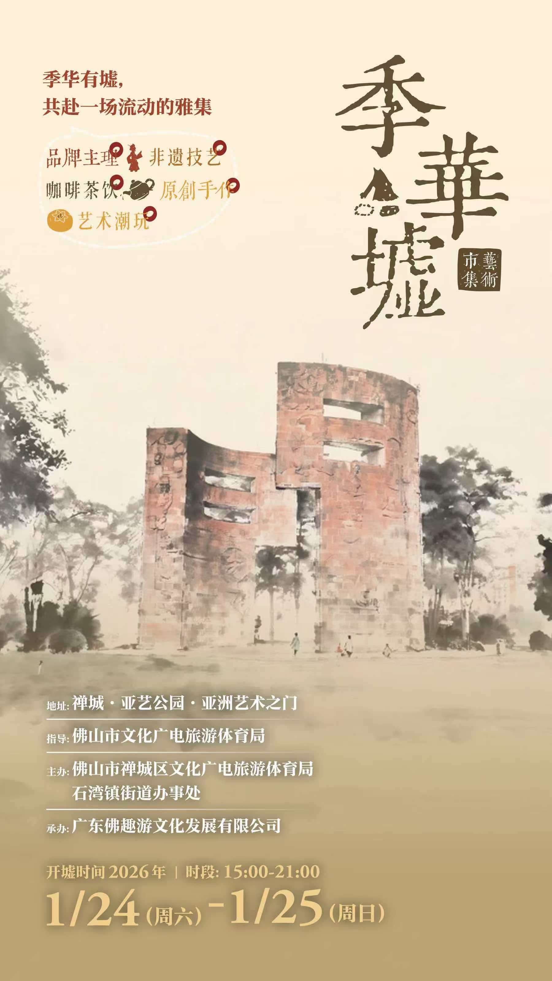当亚艺公园的湖光草坪浸润着唐宋墟脉的烟火气,当石湾窑的千年窑火遇上国际艺术清风,1月24日,佛山“季华墟”艺术潮玩市集在“亚洲艺术之门”前热闹启幕。