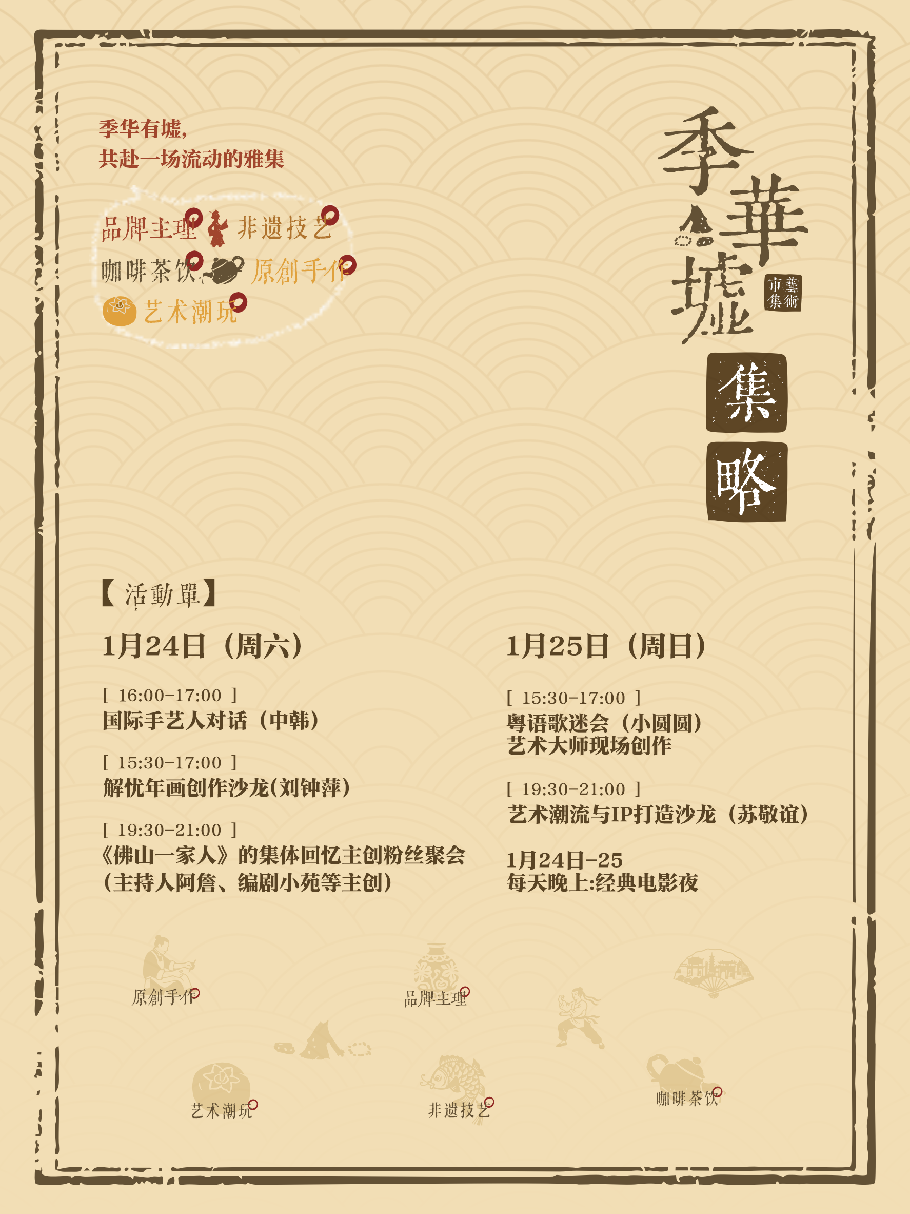 1月25日,“季华墟”的精彩仍在继续。粤语歌迷会、“艺术潮流与IP打造”沙龙将陆续登场,那些没来得及打卡的手艺摊位、没体验够的拓印拉坯,都在亚艺公园等候大家。