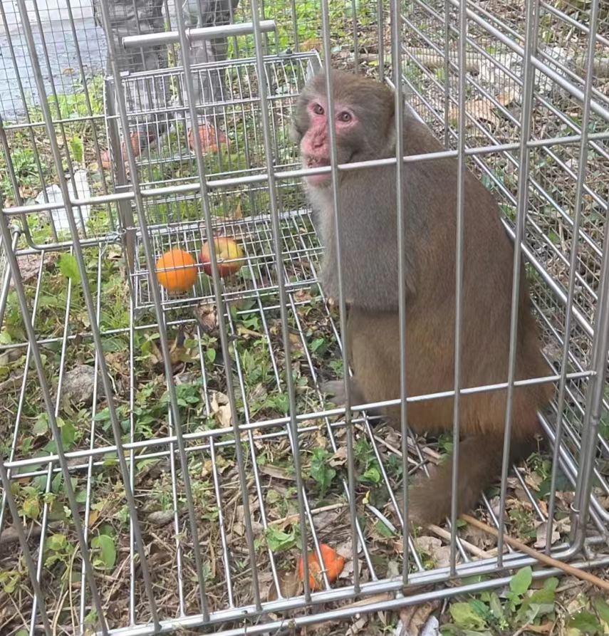 为保障猕猴安全,避免强行抓捕造成二次伤害,镇林业发展中心与市野生动物救护中心制定了温和的救助方案。工作人员连续多日在猕猴活动区域定时定点投喂,逐步与猕猴建立信任、形成 “沟通”,降低其对人类的戒备心。在建立足够信任后,工作人员利用诱捕笼进行专业诱捕,顺利将这只猕猴成功捕获,整个救助过程高效且无二次伤害。