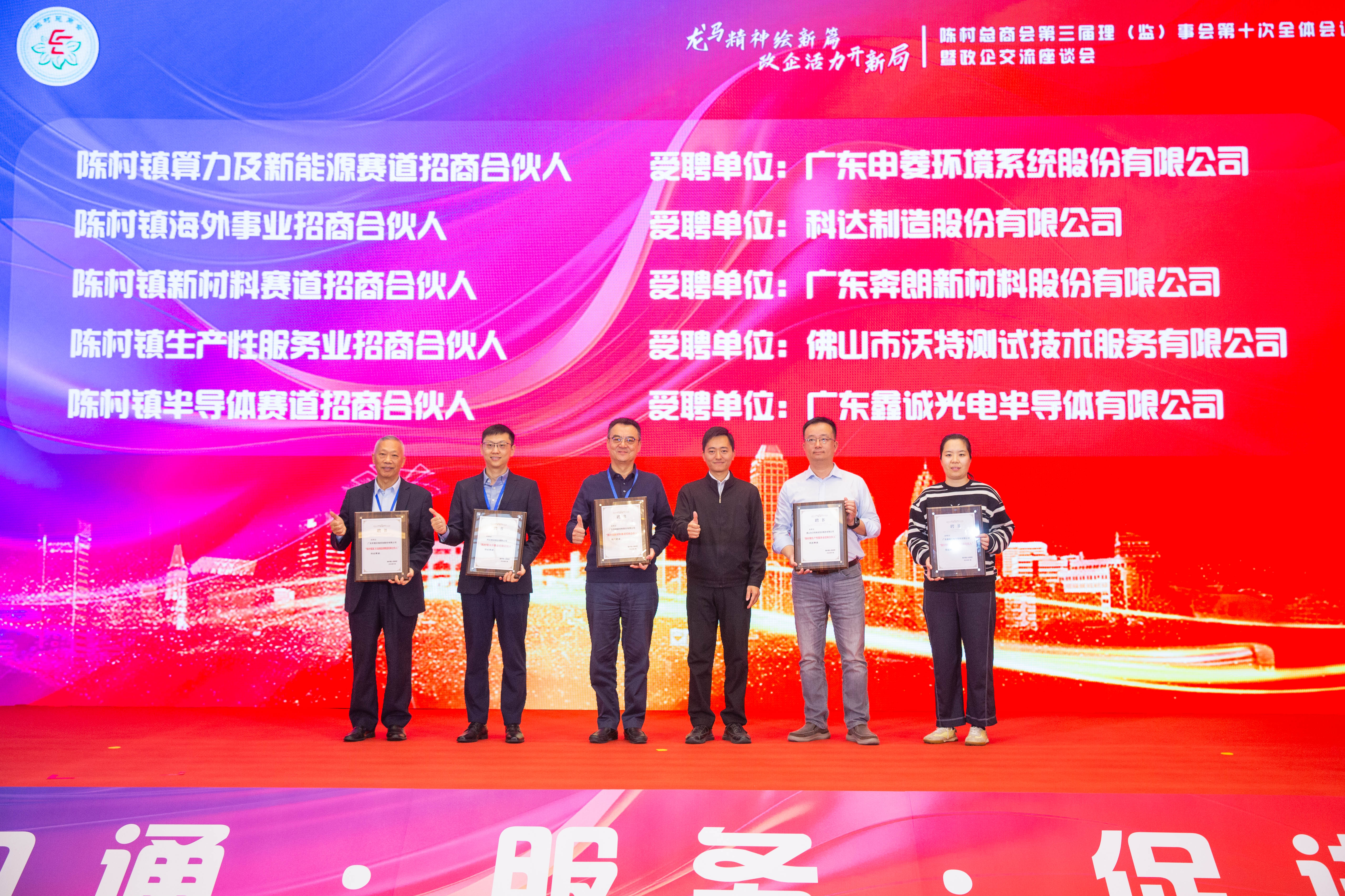 例如,“陈村镇招商首席合伙人”陈村总商会,作为政企协同的重要枢纽,积极联动各方力量、服务地方经济;申菱环境成为陈村镇算力及新能源赛道招商合伙人,科达制造成为陈村镇海外事业招商合伙人,奔朗新材成为陈村镇新材料赛道招商合伙人,沃特测试成为陈村镇生产性服务业招商合伙人,鑫诚光电则是陈村镇半导体赛道招商合伙人。