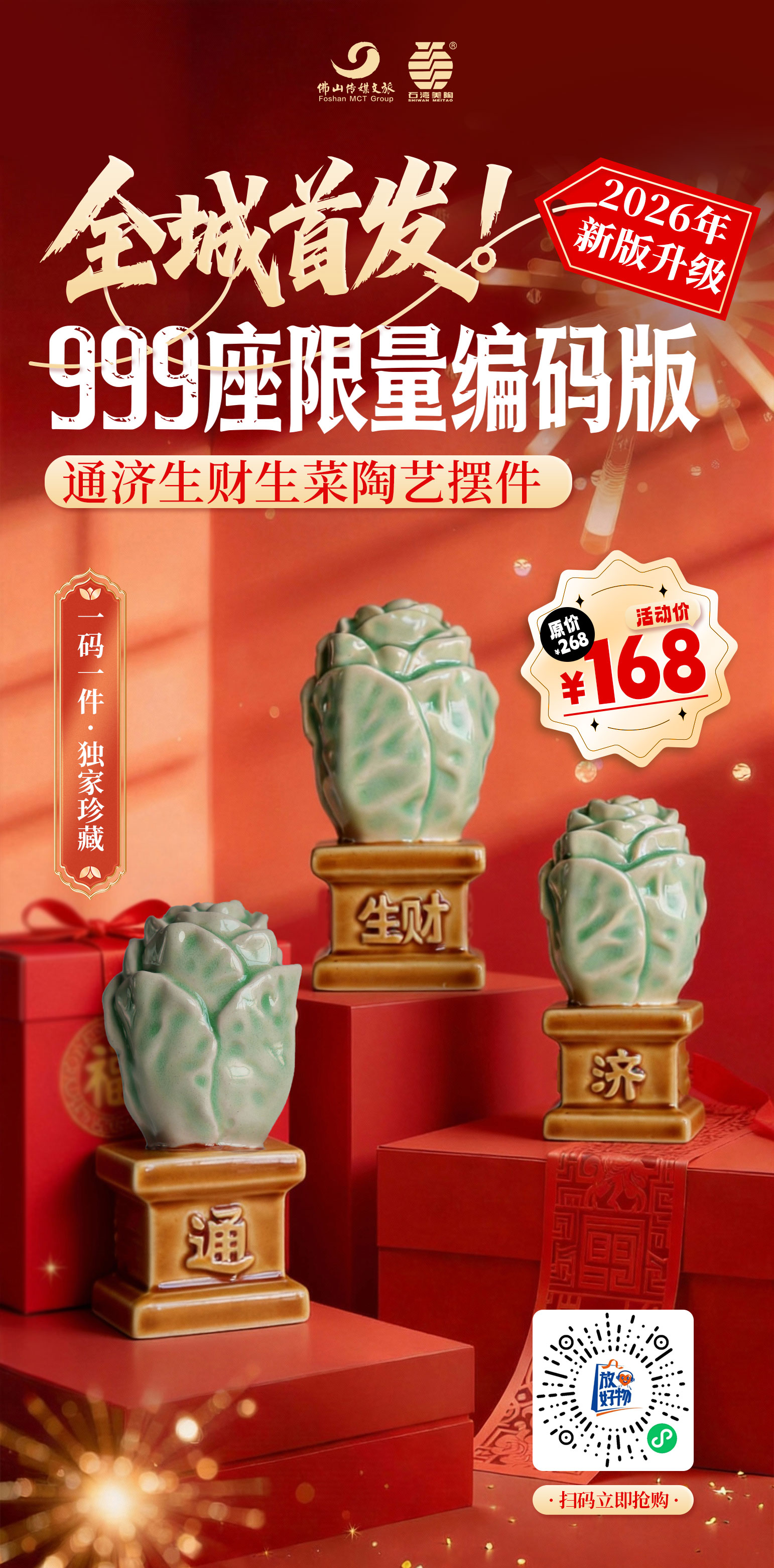 还记得去年元宵节通济桥上那个超火的“生菜”吗?对!就是那个让佛山人排长队、手快有手慢无的“生财小绿宝”——广东省陶瓷艺术大师梅晓山打造的陶瓷生菜摆件,它又杀回来了!这款仅掌心大小的文创作品,以石湾美陶非遗技艺为底蕴,将佛山“行通济”民俗中“引财归家”的吉祥寓意凝于一体,自预售起便引发广泛关注。
