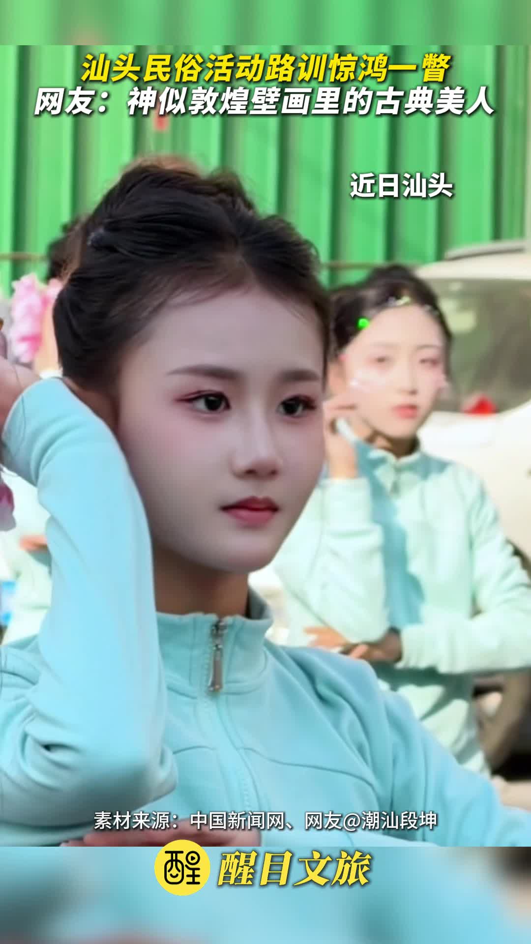 汕头民俗活动路训现场,女生眉眼如画,神似敦煌壁画里的古典美人。