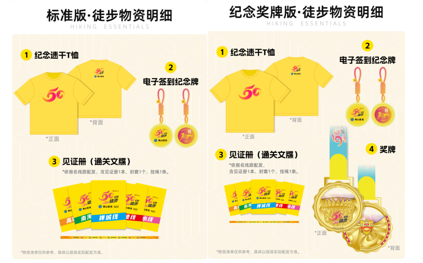 2.纪念奖牌版:88元/份。含纪念速干T恤1件;电子签到纪念牌1个(与本人身份信息绑定,具有唯一性);见证册(通关文牒)1套,包含见证册1本、封套1个、挂绳1条;AI合拍电子照片1张;第十届佛山50公里徒步纪念奖牌1枚。同时可享受各站点饮用水补给、沿途站点基础医疗和救援、活动保险等服务。