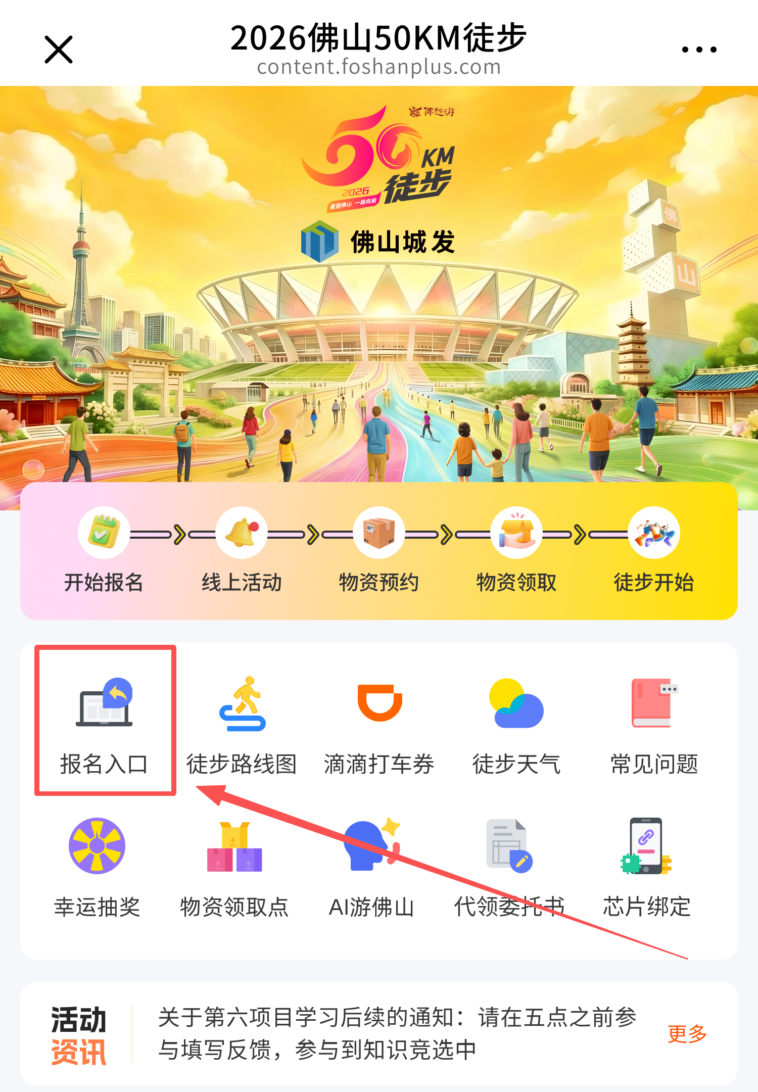 第一步:微信搜索“佛趣游”小程序,首页点击进入【佛山50公里徒步】报名入口。