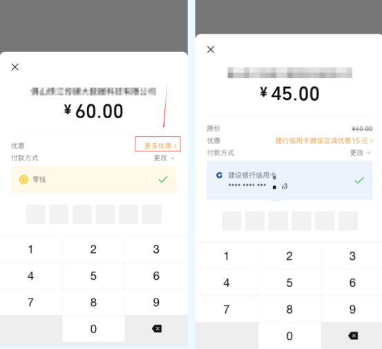 第四步:在微信支付页面点击【更多优惠】后,选择【建设银行信用卡】,即可自动享满60减15优惠!本次活动仅限20000个名额,先到先得,速来领取!