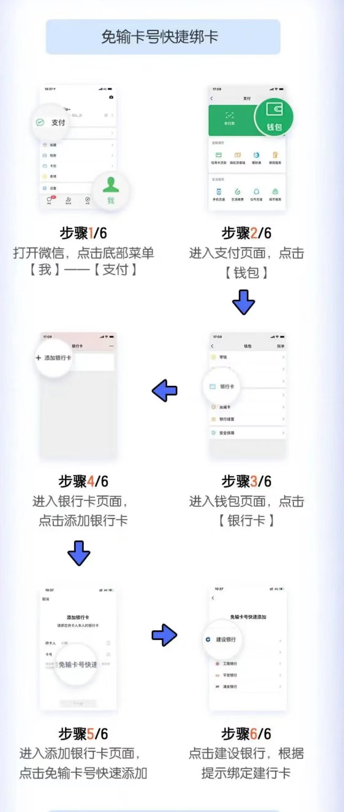 温馨提示:一定要记得提前绑定建设银行信用卡,微信绑定建设银行信用卡的步骤如下:在微信钱包页面,选择“免输卡号快捷绑卡”进入,按指示操作后选择建行的信用卡绑定即可。