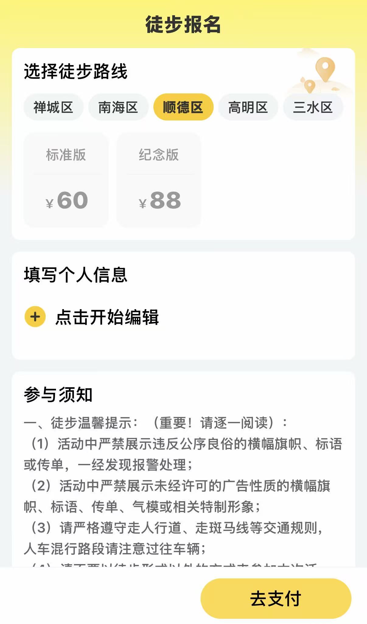 第三步:选择你的徒步路线,填写个人信息后,点击“去支付”按钮开始支付。