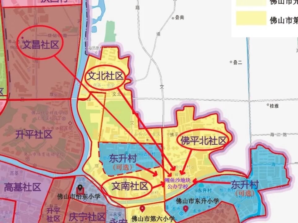 ▶文昌社区,从原佛山市禅城区怡东小学、第十三小学招生地段,调整至鲤鱼沙地块公办学校;