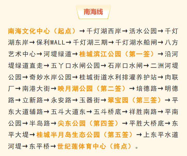 在五条主题线路中,南海线以其“再造一个新佛山,南海担当新枢纽”的独特定位,巧妙融合“海、陆、空”多维体验,形成一条有辨识度、有记忆点的城市探索路径。全程约41公里,设5个签到点,从崭新城市地标南海文化中心出发,一路延伸至世纪莲体育中心,不仅是一次体能挑战,更是一场感知城市脉动的沉浸之旅。