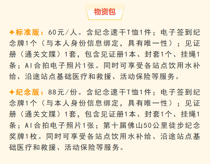 佛山城发、佛趣游联合总冠名——“美丽佛山 一路向前”2026佛山50公里徒步将于3月21日(星期六)08:00至22:00举行,全市五区线路同步开展,总规模11万人,南海线名额为3万人。报名自1月28日开始,额满即止。活动提供标准版(60元/人)与纪念版(88元/人)两种物资包,纪念版特别赠送以“狮韵载程,十载同行”为设计理念的第十届纪念奖牌。所有参与者均可享受沿途饮水补给、基础医疗及活动保险等服务。