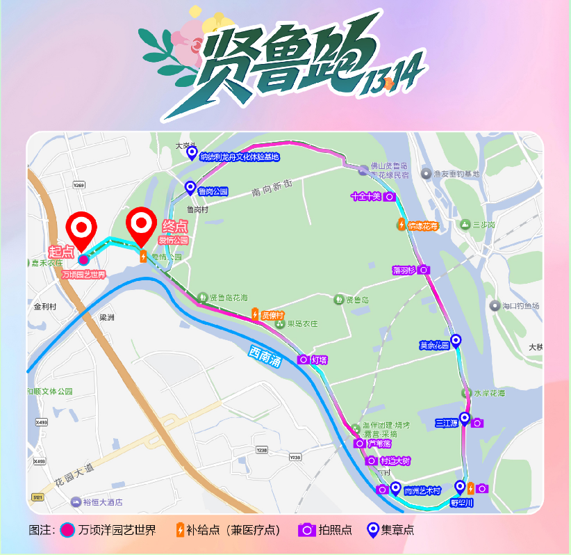无需竞速,轻松漫游也能拿奖!报名参加活动的跑友扫码关注“梦里水乡”公众号即可获得专属集章明信片,打卡岛上7大特色点位(含南洲艺术村、野望川露营地、鲁岗公园等),完成后发布社交平台,前100名跑友就能解锁价值100元的精选礼包。