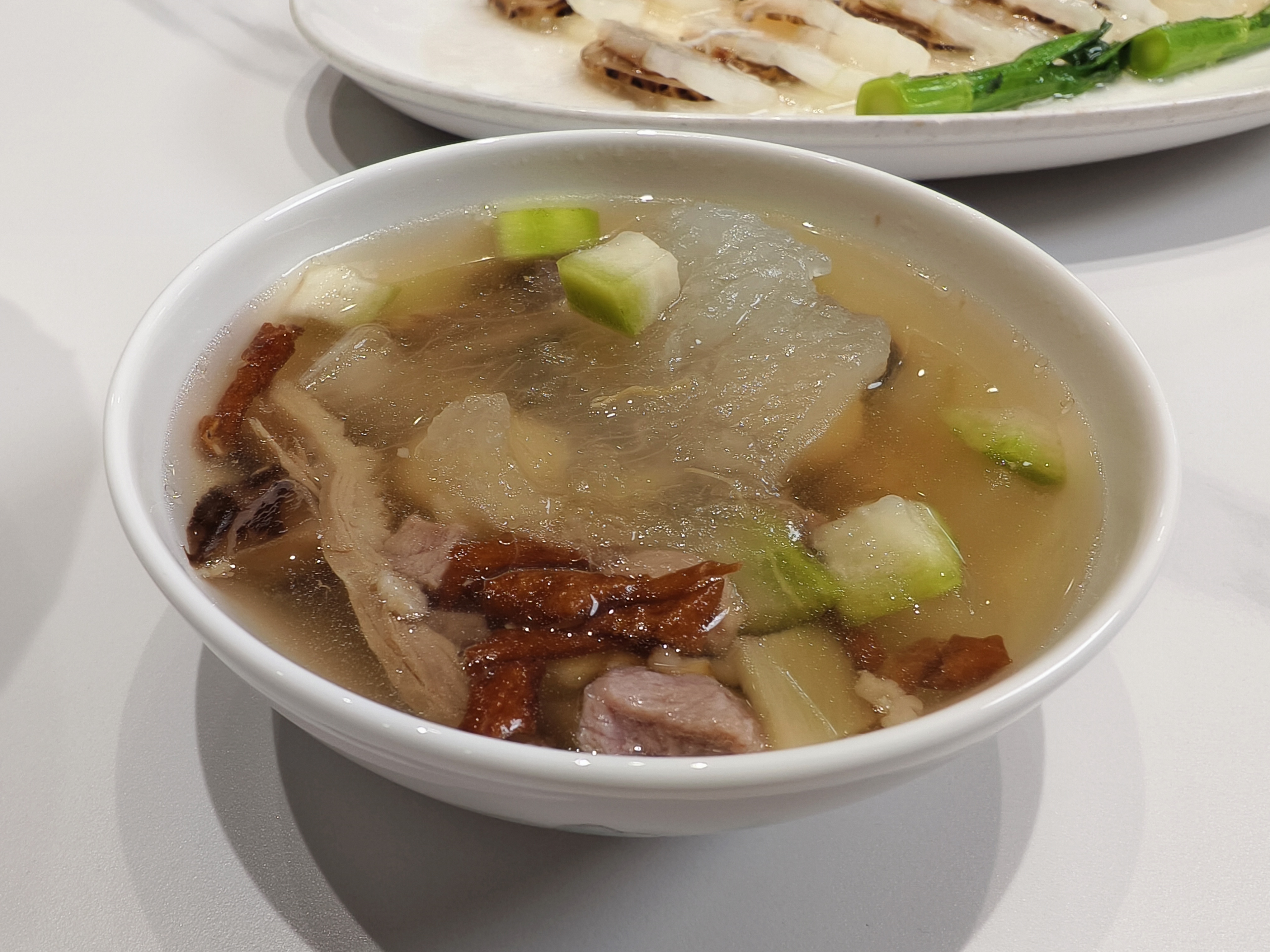 除了焖菜,冬瓜干煲汤也是顺德人的秋冬必备。健哥做的“冬瓜干瘦肉无花果汤”,做法简洁却滋味醇厚:瘦肉切片焯水,与泡发好的冬瓜干、无花果、蜜枣一同放入砂锅,加水大火烧开后转小火慢炖1小时。“这汤清热润燥,冬瓜干的清甜融合无花果的甘香,喝起来清爽不腻,是秋冬润燥的佳品。”