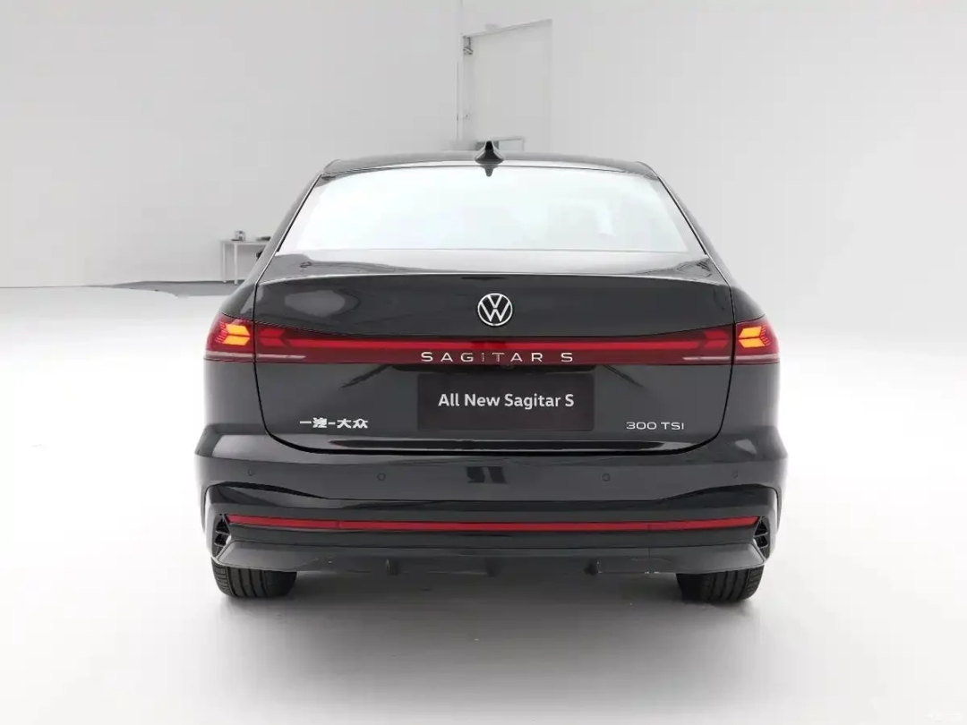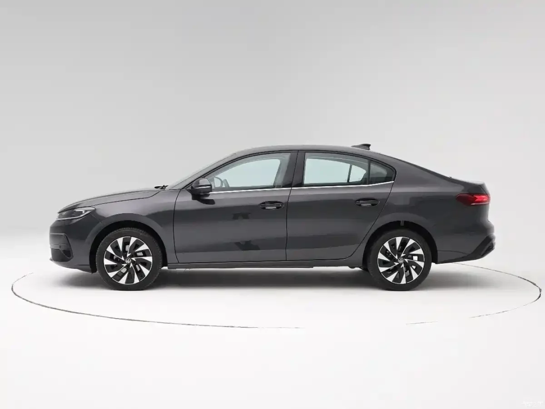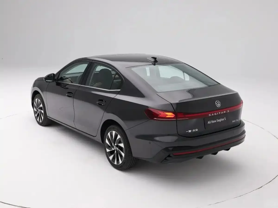 车身侧面,新车线条简洁流畅,经典的硬朗上腰线也得到保留,腰线以及车门下方筋线呈斜向贯穿车身,车顶线条末端过渡平缓,搭配舒展的型面变化,展现出强烈的动感姿态。新车并未采用隐藏式门把手设计,而是继续保留传统机械门把手。此外,新车还采用全新轮辋设计,申报信息显示,新车提供15/16/17英寸轮辋供消费者选择。尺寸方面,新车长宽高分别为4702/1815/1484mm,轴距为2688mm,定位低于目前在售的速腾L车型。作为对比,目前在售的速腾L长宽高分别为4812/1813/1479(1472)mm,轴距为2731mm,定位紧凑型A+级轿车。对比来看,新车长度减少了110mm;轴距减少43mm。车尾部分,新车尾灯采用贯穿数字化尾灯设计,后包围运用贯穿式反光条进行设计,搭载微微上翘的“小鸭尾”造型,进一步强化车辆的运动感。