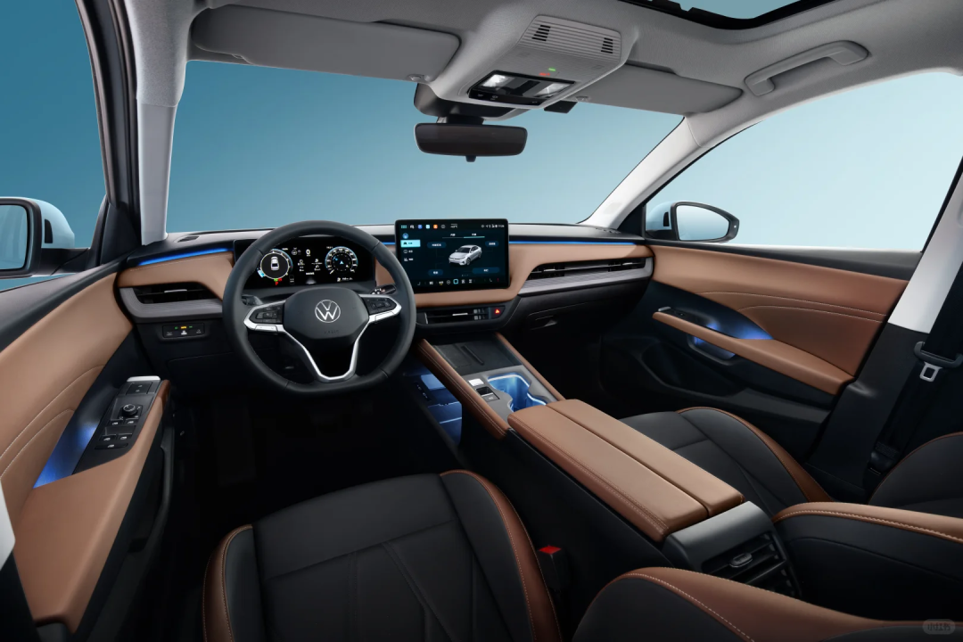 先来看看内饰部分,新车车内采用全新的设计风格,车内采用双色配色,中控台提供高分辨率12.9英寸中控大屏和10.25英寸液晶仪表盘组成的“双悬浮屏”设计,配备电子怀挡、实体按键多功能方向盘,提供AR实景导航投屏、智慧双屏交互以及30色氛围灯等功能。