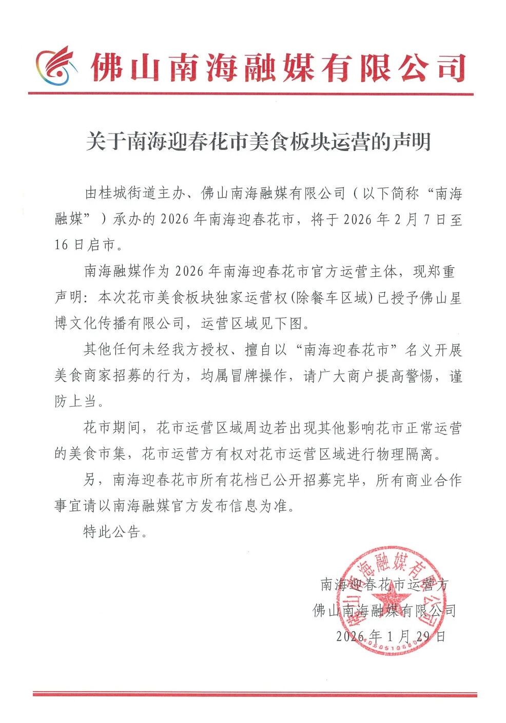 关于南海迎春花市美食板块运营的声明
