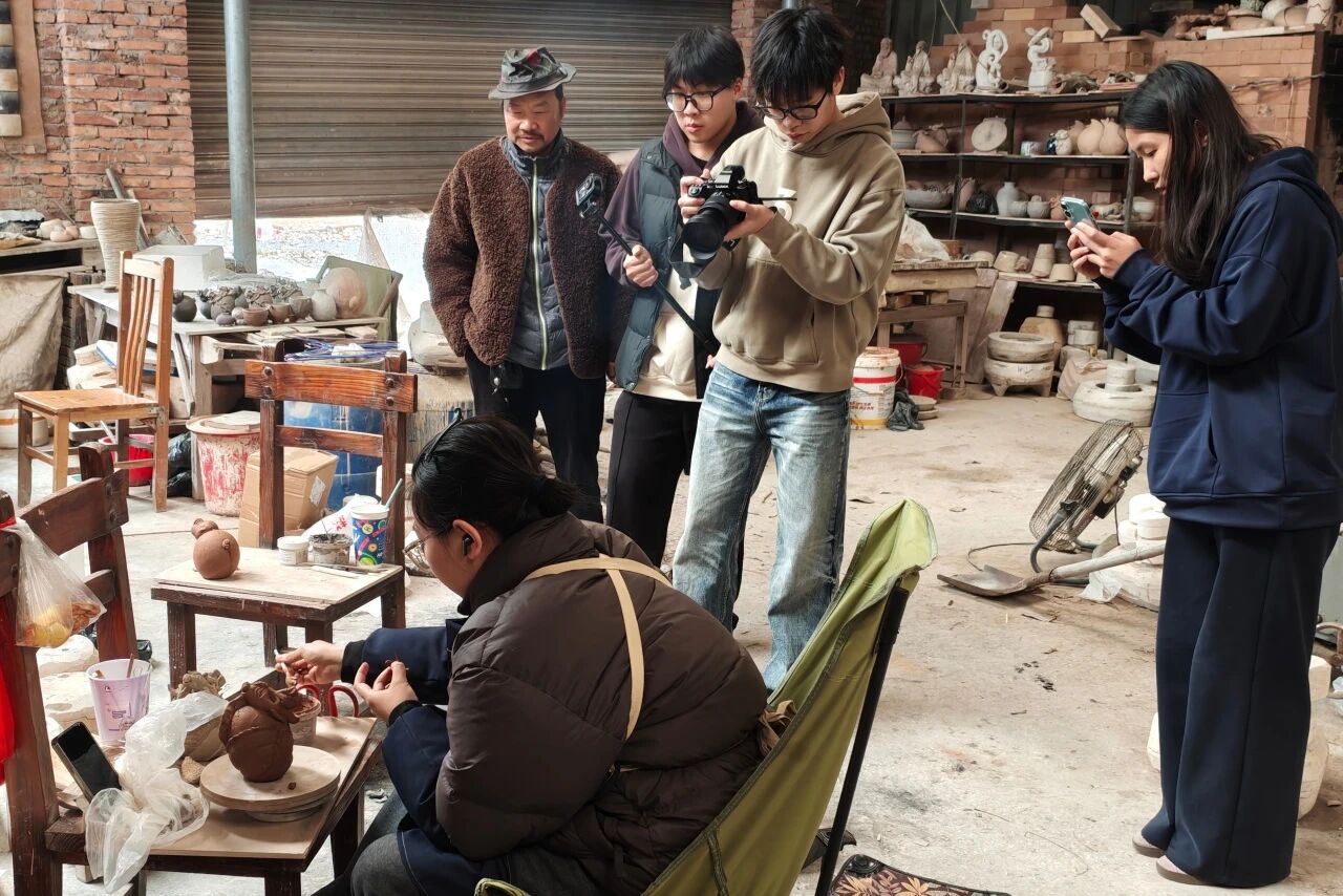 在土天陶工作室,团队探访了中国陶瓷设计艺术大师杨英才,深入了解杨老师扎根南山、结合本地陶土资源,融合改良石湾公仔技艺,并借鉴唐三彩等手法,最终独创出“南山五彩釉”的历程。团队着重调研了传统陶艺如何通过艺术教育等方式实现活态传承与市场接轨,推动南山优秀传统文化以更富时代感的方式走进公众视野,为提升南山文化软实力贡献青春智慧。