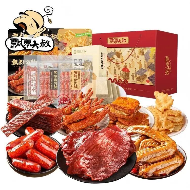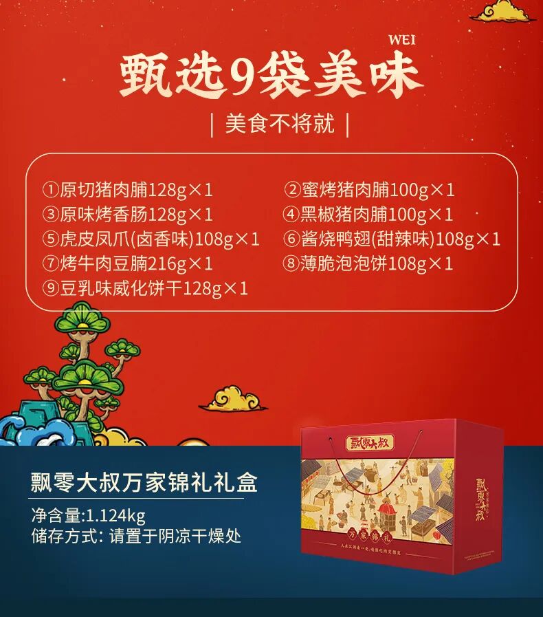 内含:原切猪肉脯128g+蜜烤猪肉脯100g+原味烤香肠128g+黑椒猪肉脯100g+虎皮凤爪(卤香味)108g+酱烧鸭翅(甜辣味)108g+烤牛肉豆腩216g+薄脆泡泡饼108g+豆乳味威化饼干128g