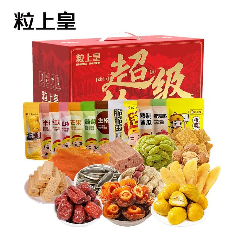 内含:板栗仁50g*2+半边梅88g*1+脆脆枣40g*2+芒果干108g*1+苦荞片25g*2+葡萄干68g*1+带壳熟花生158g*1+熟制葵瓜子168g*1+板栗层层酥120g*1+红薯条80g*1+山楂条60g*1+生核桃208g*1