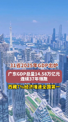31省份2025年经济“全年报”均已出炉。从经济总量上看,广东、江苏、山东、浙江、四川、河南、湖北、福建、上海、湖南位列前十。从经济增速上看,18个省份跑赢全国5%的大盘,西藏以7%的增速领跑。
