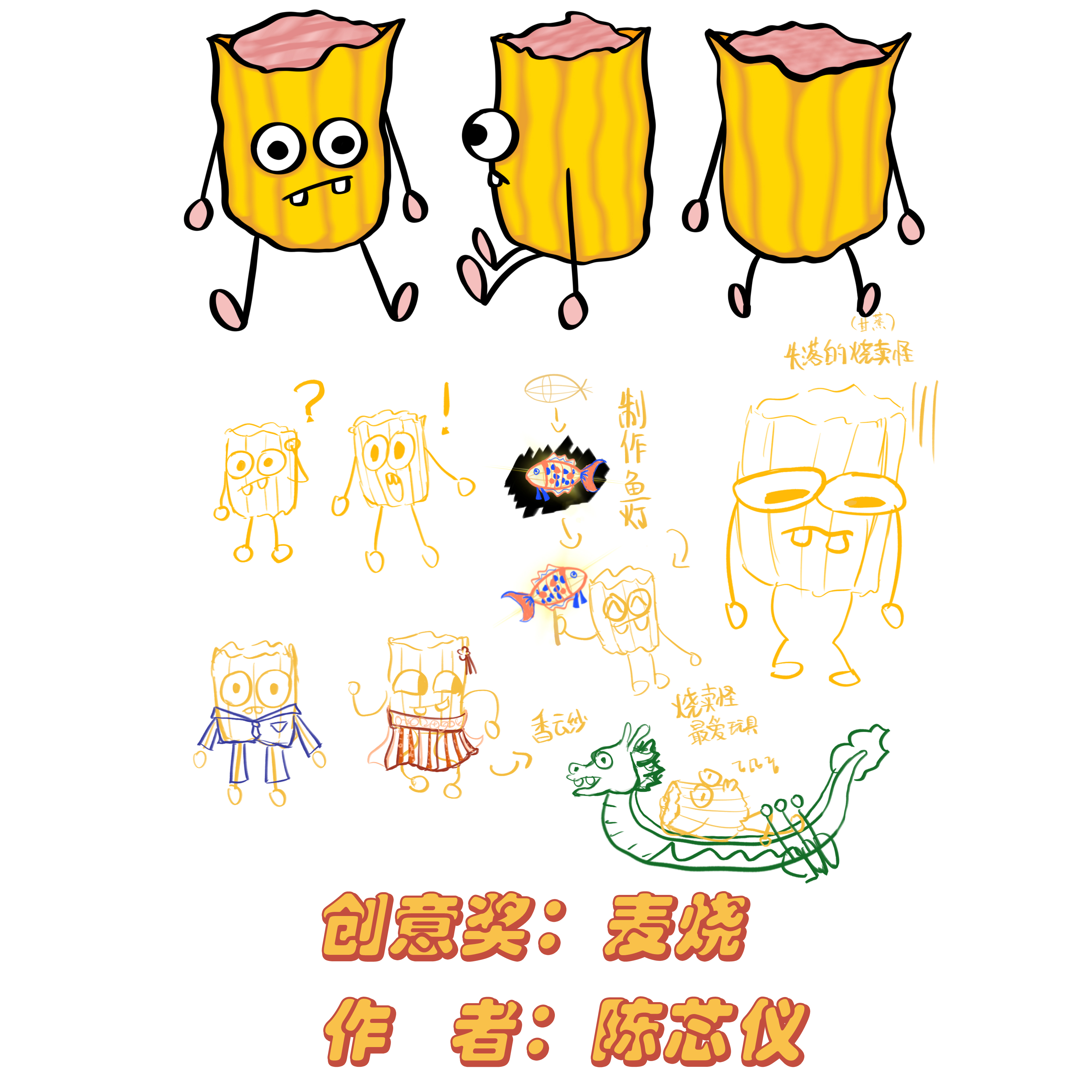 为了让“烧卖仔”形象更鲜活,陈芯仪赋予了它极具反差萌的外形:大大圆圆的眼睛透着呆萌,两颗大门牙微微外露,“丑萌”搞怪的模样让人忍俊不禁。创作过程中,最让她难忘的是眼睛的设计。起初陈芯仪反复琢磨却毫无头绪,随手画下的圆形眼睛,竟意外契合“呆萌蠢萌”的设定,成为整个形象的点睛之笔。