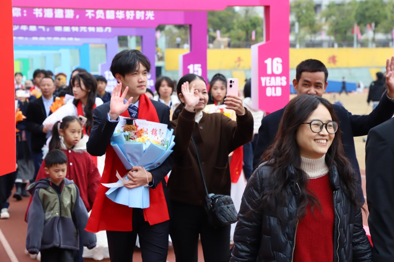 “感恩绽放”环节温情满溢。学生们手捧鲜花,走向三年来朝夕相伴的老师们。“老师,谢谢您!”深深一躬,花香伴着感恩,沁人心脾。不少老师接过花束时,眼眶微微泛红。随后,校领导为学生代表颁发成人纪念品,老师与家长并肩,为学生郑重佩戴上成人勋章。