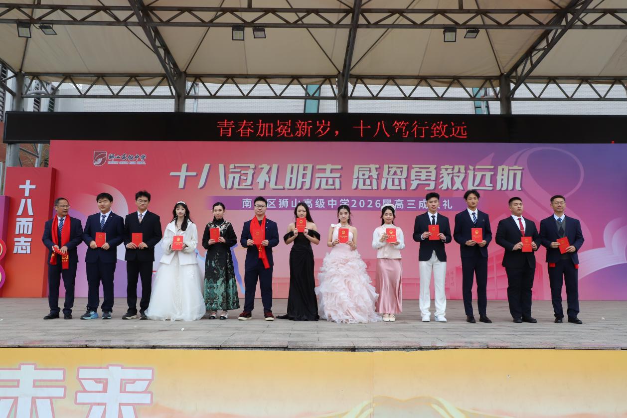 1月31日上午,狮山高级中学2026届全体高三学生身着正装,与父母、师长并肩而立,共同迎来以“十八冠礼明志,感恩勇毅远航”为主题的成人礼仪式。在庄严的国歌声中,一场关乎成长、感恩与承诺的仪式,浸润着湿润的空气,深情启幕。