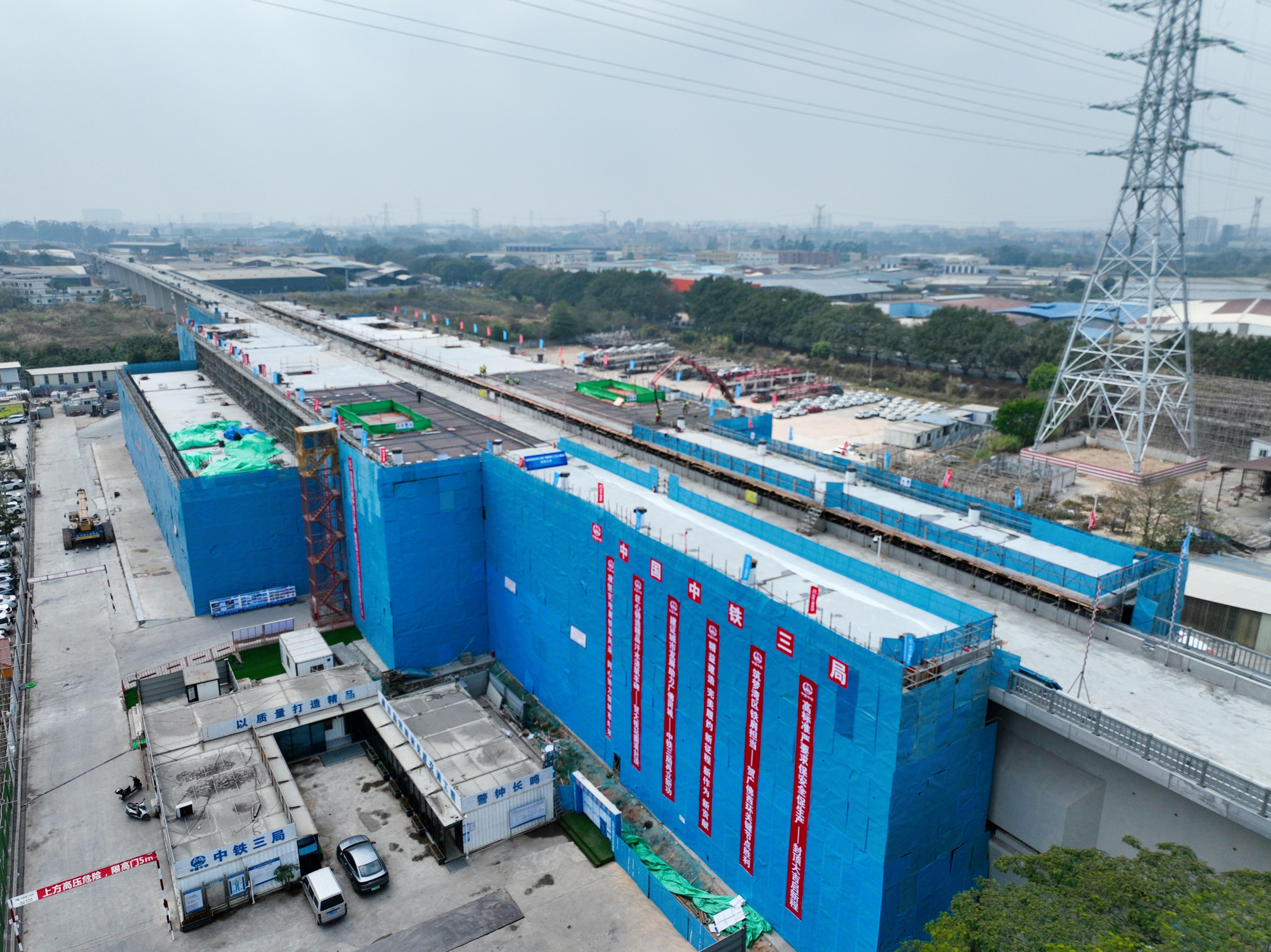 面对建设难题,广州地铁集团锚定整体目标,以系统思维破解施工难题,先后克服邻近高压线路吊装、高支模、预应力施工等技术难点,通过高效协同与精益管理,稳步推动项目建设。技术上,坚持大胆创新,在炭步站应用“桥建合一”结构与岩溶预注膏浆技术,全线推广承插式盘扣脚手架、智能温控等先进工艺;管理上,坚持聚力协同,成立专项攻坚组,高效破解征拆与管线迁改梗阻问题,推动狮山东站通过优化方案节省工期约10个月;组织上,坚持科学谋划,通过组建党员突击队、启动应急预案等方式,应对复杂预应力张拉、雨季施工等难题,最终实现了各站主体结构“零事故”高质量封顶,炭步站封顶更较原计划提前一个月告竣。