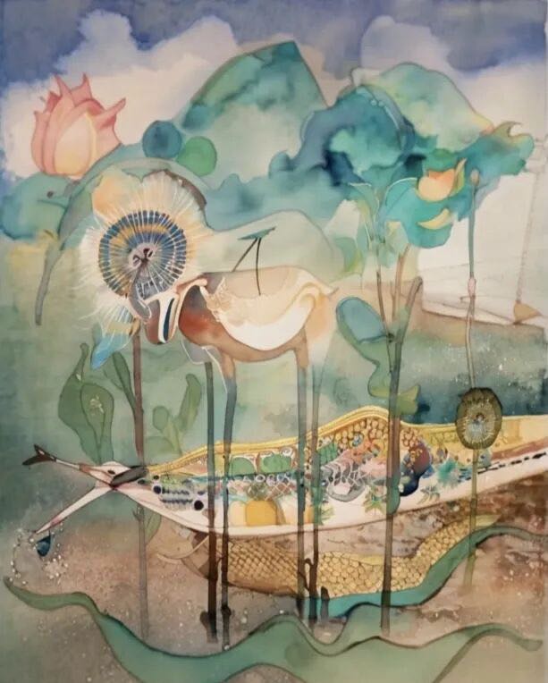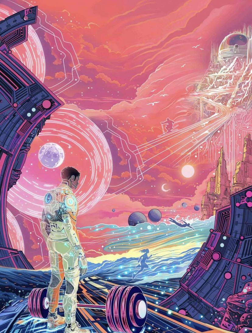 “异轨”指向四位艺术家迥然不同的艺术语言与探索方向。王橒的作品充满哲学性的视觉隐喻,其创作扎根于对生命路径的静观与诗性表达。张元哲则以先锋数字绘画见长,作为与刘慈欣等多位海内外知名作家合作的插画师,他将叙事性与数字媒介的边界不断推演。蒋焕松专注于抽象色彩的实验,其经历涵盖主题公园设计与公共艺术,色彩在他的画面中成为情感与空间的纯粹载体。王浩新则致力于当代叙事性创作,其版画学术背景为作品注入了深厚的结构意识与人文关切。