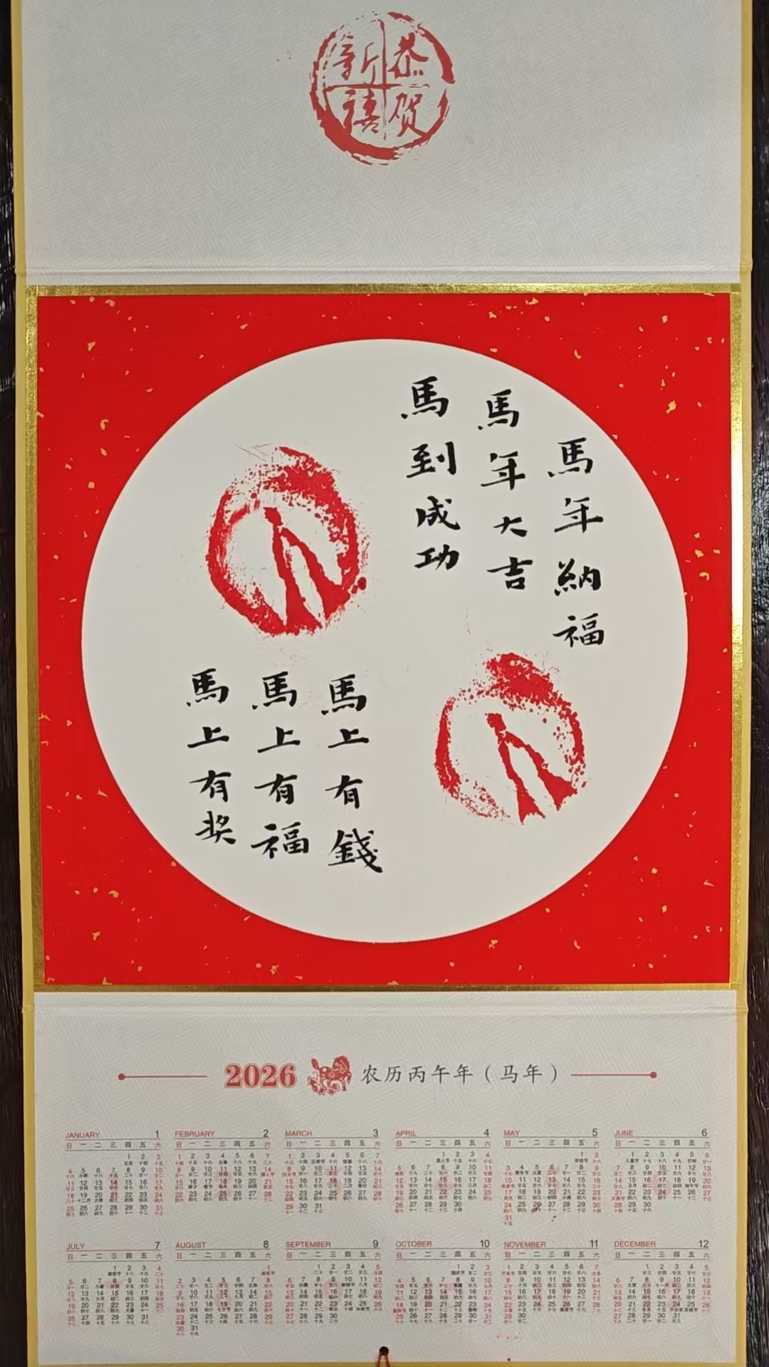 马年挂历上,“小麻花”的马蹄印圆润饱满、纹路清晰,每一枚印记都因马蹄自然状态而独一无二;搭配佛山女书法家陈爱弟亲笔题写的“马年有福”四字行书,笔墨遒劲中暗藏温婉韵味,将生肖马文化、传统书法艺术与矮马萌感巧妙融合,让每一页挂历都兼具观赏性与纪念价值。
